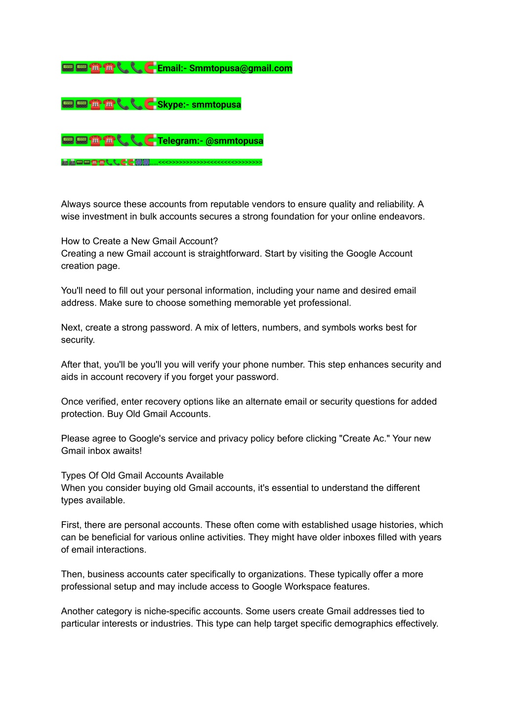 ??☎☎???Email:- Smmtopusa@gmail.com ??☎☎???Skype:- smmtopusa ??☎☎???Telegram:- @smmtopusa ????☎☎??????,,,,,<<<>>>>>>>>>>><<<<<<<<>>>>>>>> Always source these accounts from reputable vendors to ensure quality and reliability. A wise investment in bulk accounts secures a strong foundation for your online endeavors. How to Create a New Gmail Account? Creating a new Gmail account is straightforward. Start by visiting the Google Account creation page. You'll need to fill out your personal information, including your name and desired email address. Make sure to choose something memorable yet professional. Next, create a strong password. A mix of letters, numbers, and symbols works best for security. After that, you'll be you'll you will verify your phone number. This step enhances security and aids in account recovery if you forget your password. Once verified, enter recovery options like an alternate email or security questions for added protection. Buy Old Gmail Accounts. Please agree to Google's service and privacy policy before clicking "Create Ac." Your new Gmail inbox awaits! Types Of Old Gmail Accounts Available When you consider buying old Gmail accounts, it's essential to understand the different types available. First, there are personal accounts. These often come with established usage histories, which can be beneficial for various online activities. They might have older inboxes filled with years of email interactions. Then, business accounts cater specifically to organizations. These typically offer a more professional setup and may include access to Google Workspace features. Another category is niche-specific accounts. Some users create Gmail addresses tied to particular interests or industries. This type can help target specific demographics effectively.