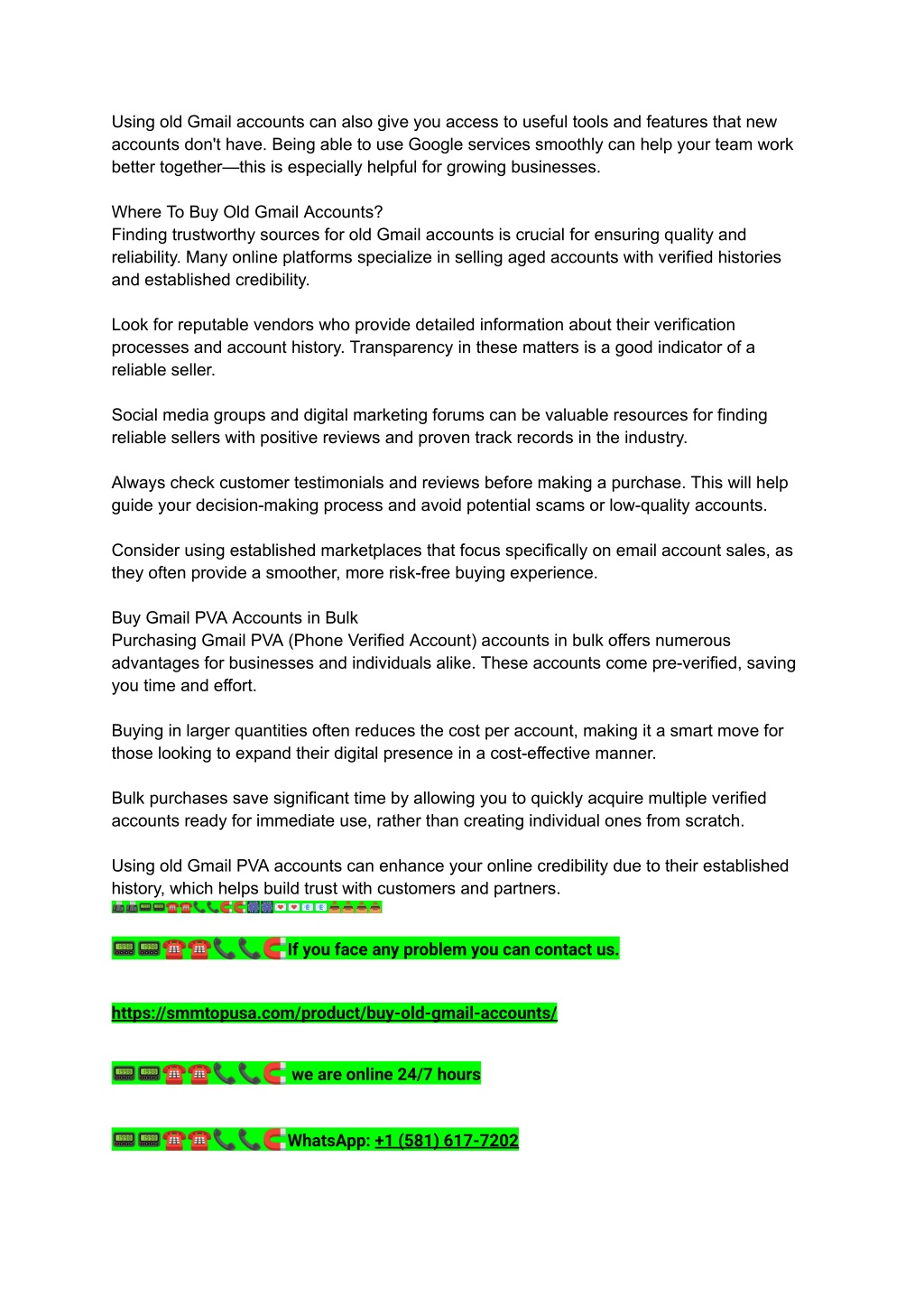 Using old Gmail accounts can also give you access to useful tools and features that new accounts don't have. Being able to use Google services smoothly can help your team work better together—this is especially helpful for growing businesses. Where To Buy Old Gmail Accounts? Finding trustworthy sources for old Gmail accounts is crucial for ensuring quality and reliability. Many online platforms specialize in selling aged accounts with verified histories and established credibility. Look for reputable vendors who provide detailed information about their verification processes and account history. Transparency in these matters is a good indicator of a reliable seller. Social media groups and digital marketing forums can be valuable resources for finding reliable sellers with positive reviews and proven track records in the industry. Always check customer testimonials and reviews before making a purchase. This will help guide your decision-making process and avoid potential scams or low-quality accounts. Consider using established marketplaces that focus specifically on email account sales, as they often provide a smoother, more risk-free buying experience. Buy Gmail PVA Accounts in Bulk Purchasing Gmail PVA (Phone Verified Account) accounts in bulk offers numerous advantages for businesses and individuals alike. These accounts come pre-verified, saving you time and effort. Buying in larger quantities often reduces the cost per account, making it a smart move for those looking to expand their digital presence in a cost-effective manner. Bulk purchases save significant time by allowing you to quickly acquire multiple verified accounts ready for immediate use, rather than creating individual ones from scratch. Using old Gmail PVA accounts can enhance your online credibility due to their established history, which helps build trust with customers and partners. ????☎☎?????????????? ??☎☎???If you face any problem you can contact us. https://smmtopusa.com/product/buy-old-gmail-accounts/ ??☎☎??? we are online 24/7 hours ??☎☎???WhatsApp: +1 (581) 617-7202
