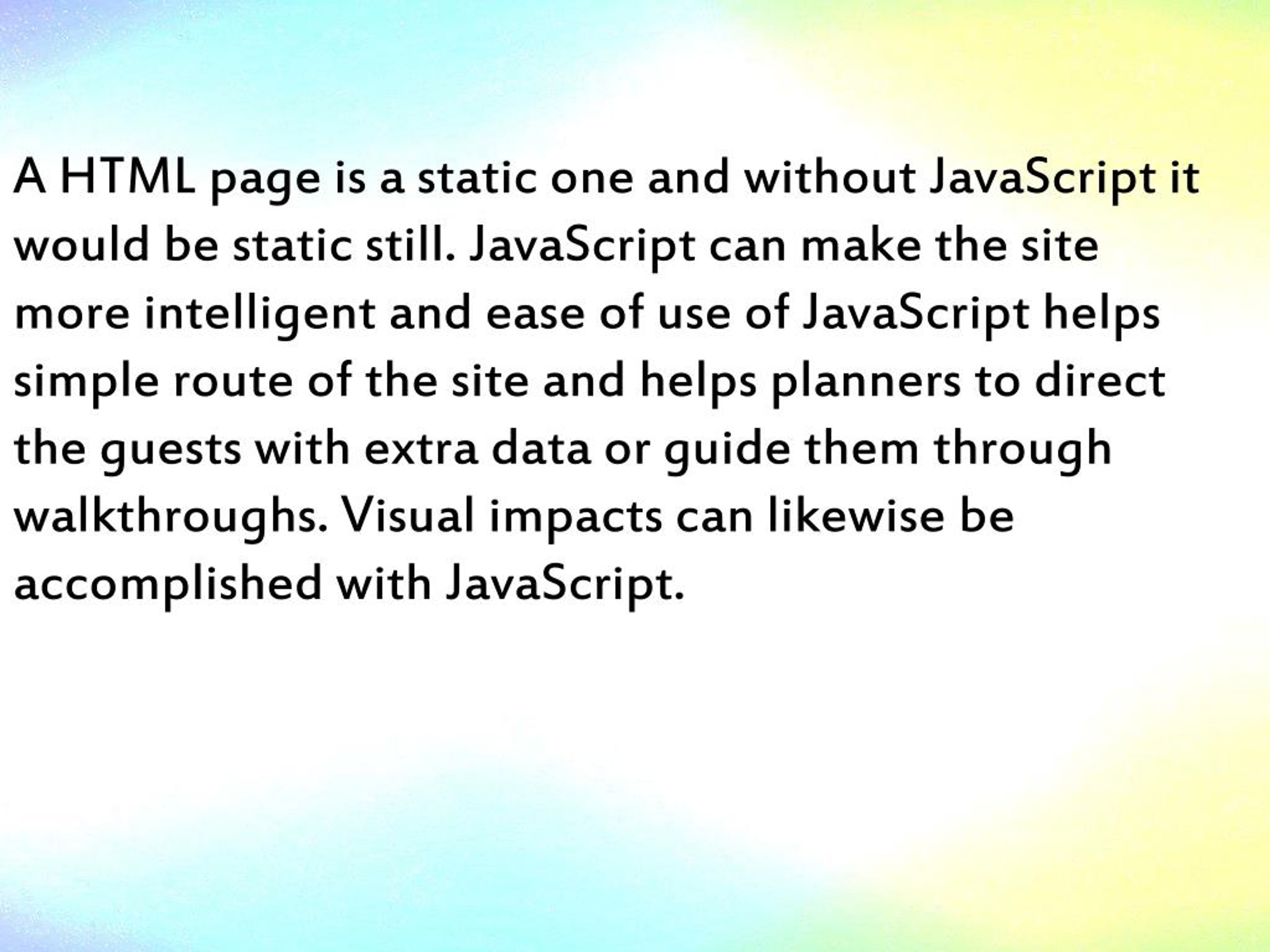 A HTML page is a static one and without JavaScript it would be static still. JavaScript can make the site more intelligent and ease of use of JavaScript helps simple route of the site and helps planners to direct the guests with extra data or guide them through walkthroughs. Visual impacts can likewise be accomplished with JavaScript.