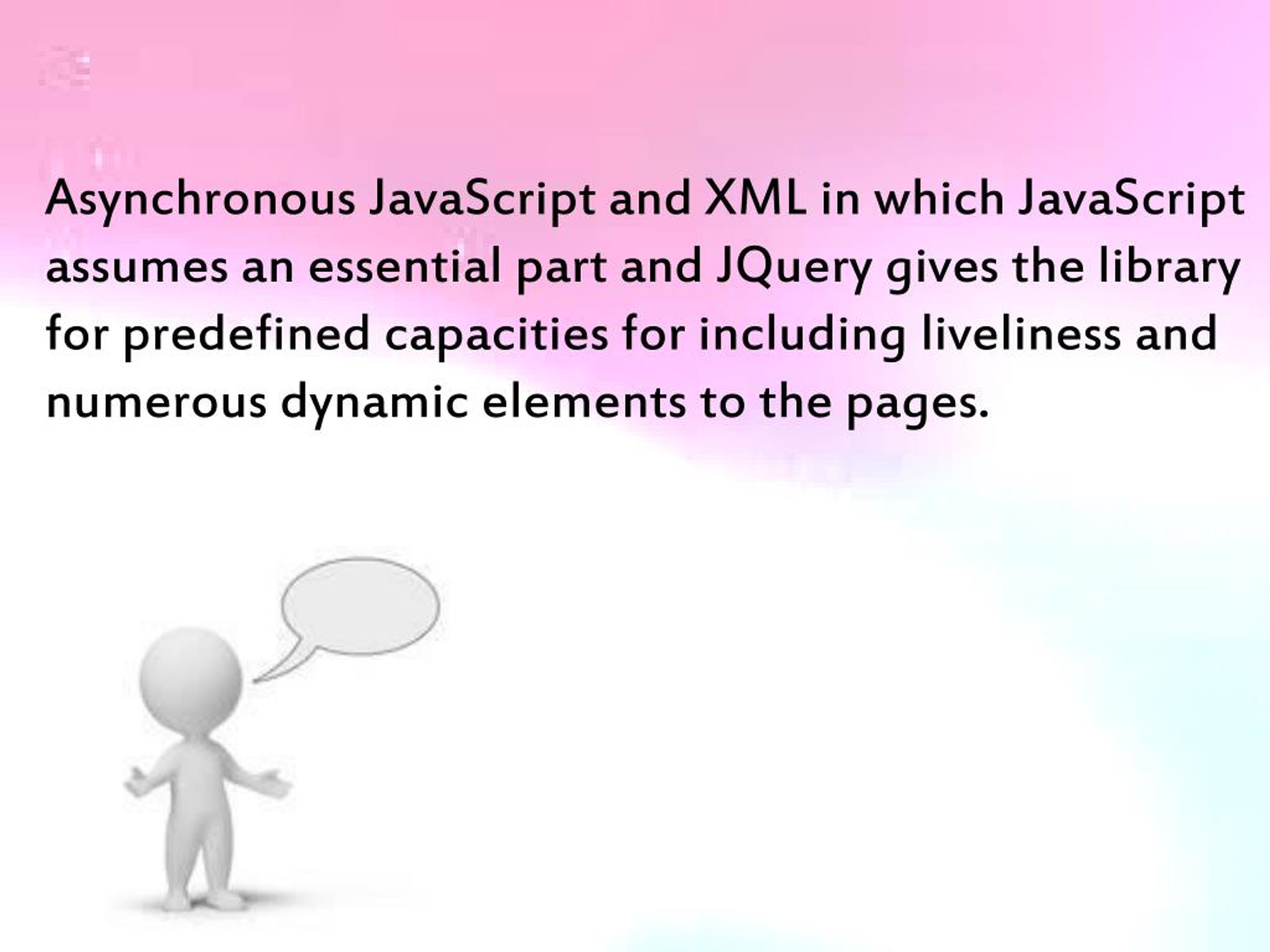 Asynchronous JavaScript and XML in which JavaScript assumes an essential part and JQuery gives the library for predefined capacities for including liveliness and numerous dynamic elements to the pages.
