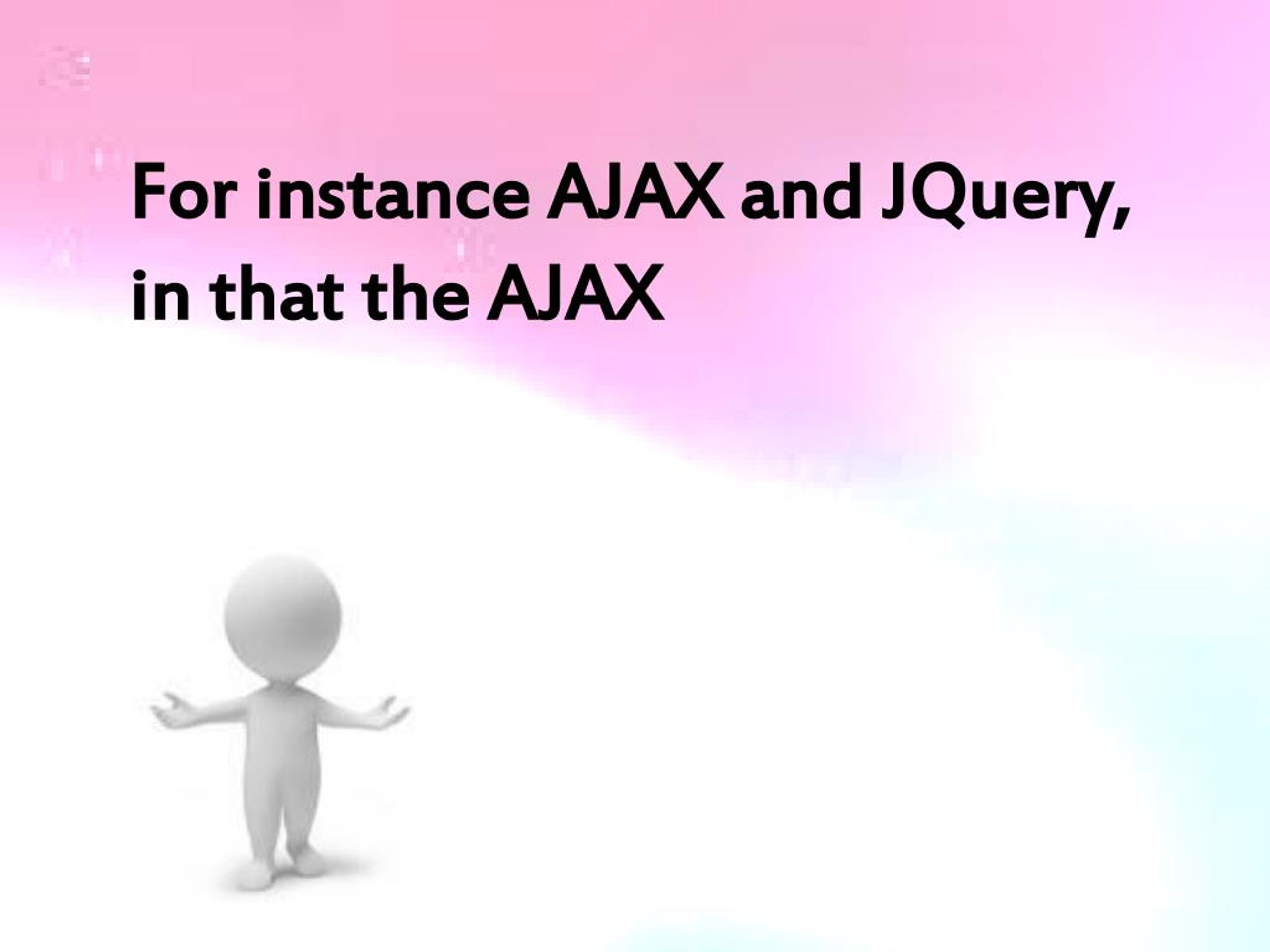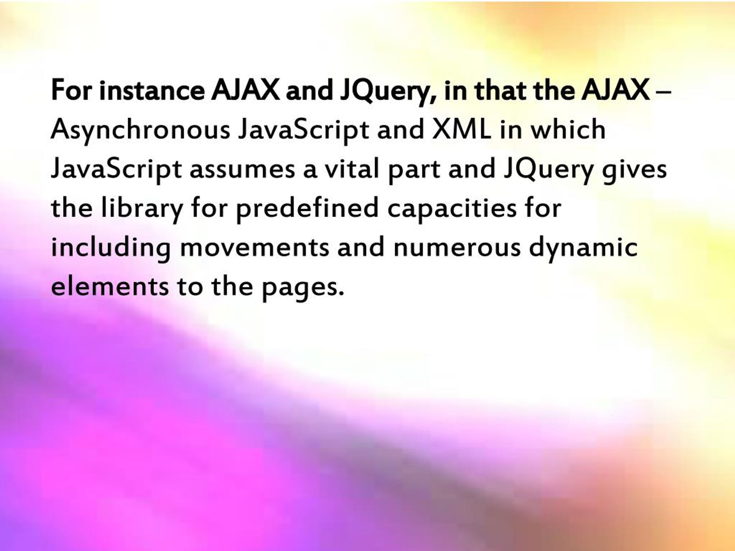 For instance AJAX and JQuery, in that the AJAX – Asynchronous JavaScript and XML in which JavaScript assumes a vital part and JQuery gives the library for predefined capacities for including movements and numerous dynamic elements to the pages.