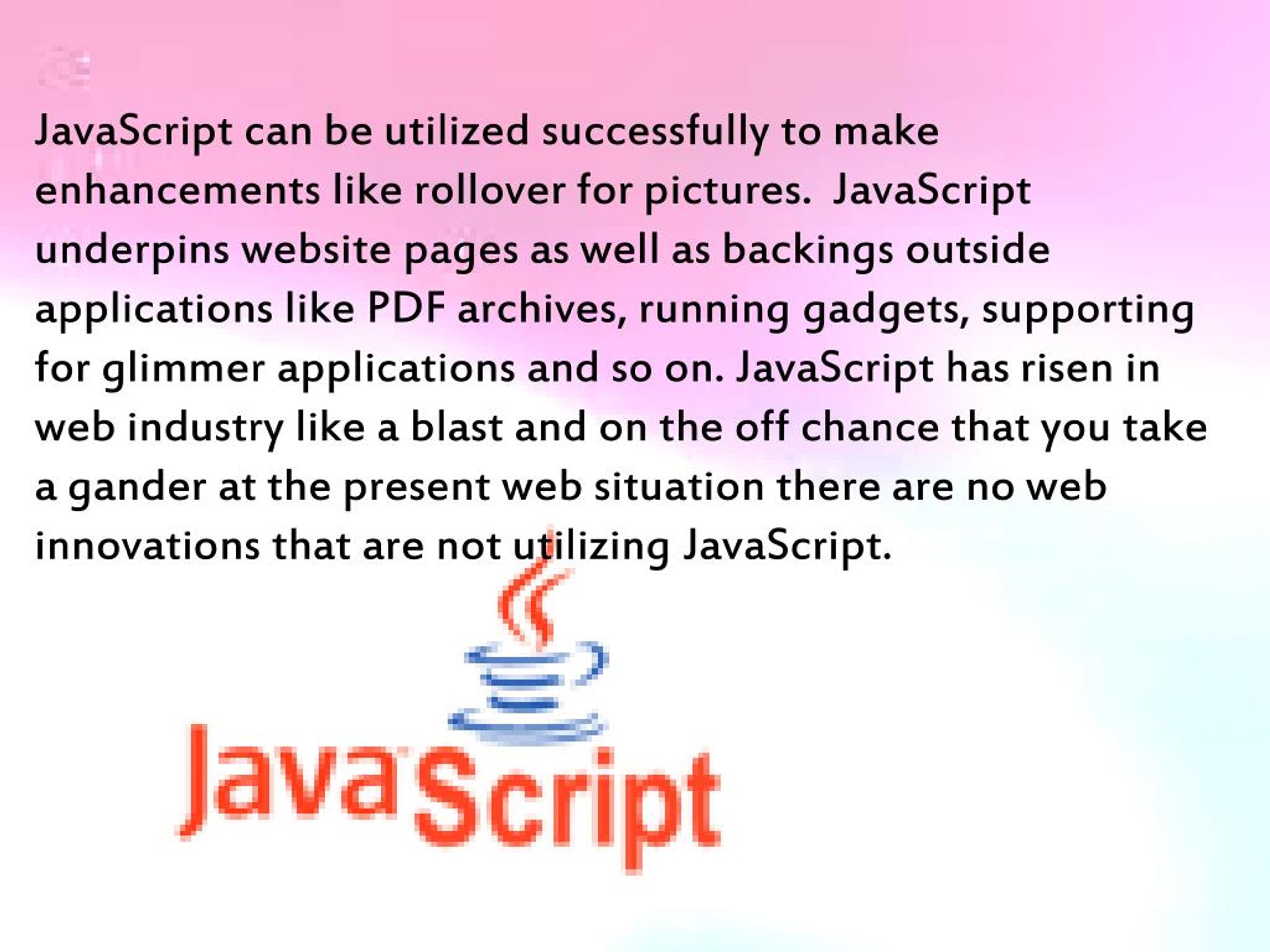 JavaScript can be utilized successfully to make enhancements like rollover for pictures. JavaScript underpins website pages as well as backings outside applications like PDF archives, running gadgets, supporting for glimmer applications and so on. JavaScript has risen in web industry like a blast and on the off chance that you take a gander at the present web situation there are no web innovations that are not utilizing JavaScript.