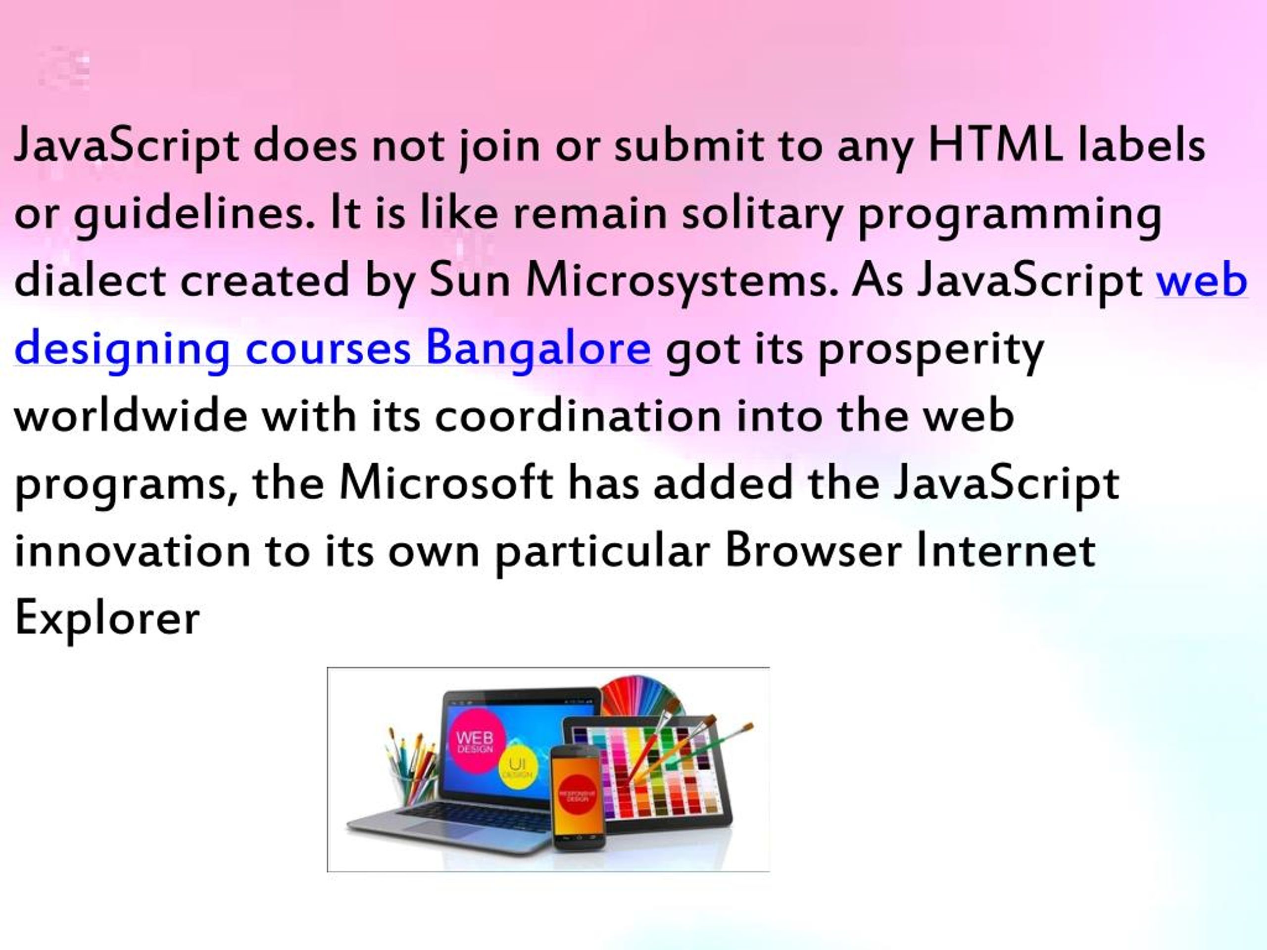 JavaScript does not join or submit to any HTML labels or guidelines. It is like remain solitary programming dialect created by Sun Microsystems. As JavaScript web designing courses Bangalore got its prosperity worldwide with its coordination into the web programs, the Microsoft has added the JavaScript innovation to its own particular Browser Internet Explorer