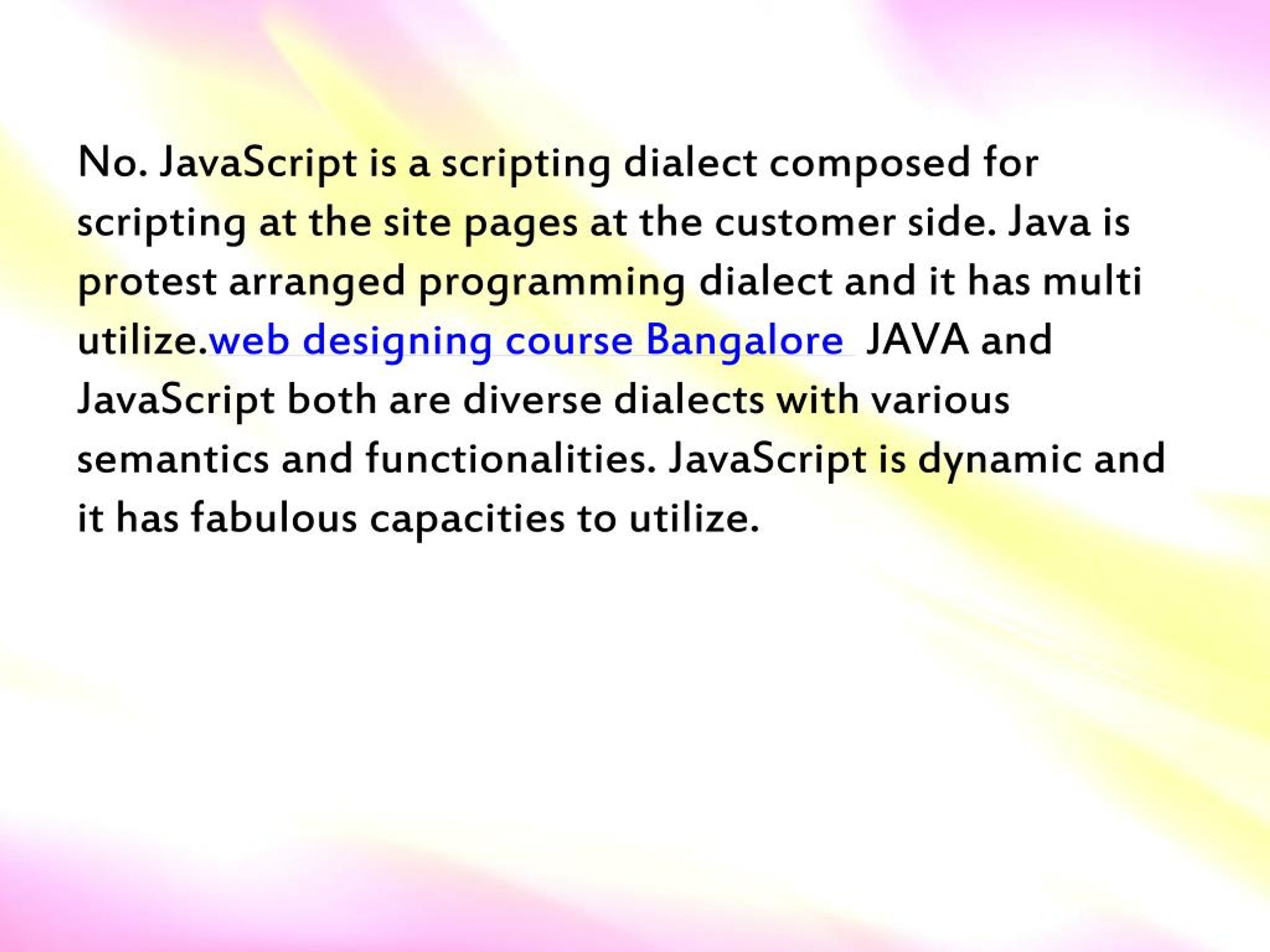No. JavaScript is a scripting dialect composed for scripting at the site pages at the customer side. Java is protest arranged programming dialect and it has multi utilize.web designing course Bangalore JAVA and JavaScript both are diverse dialects with various semantics and functionalities. JavaScript is dynamic and it has fabulous capacities to utilize.