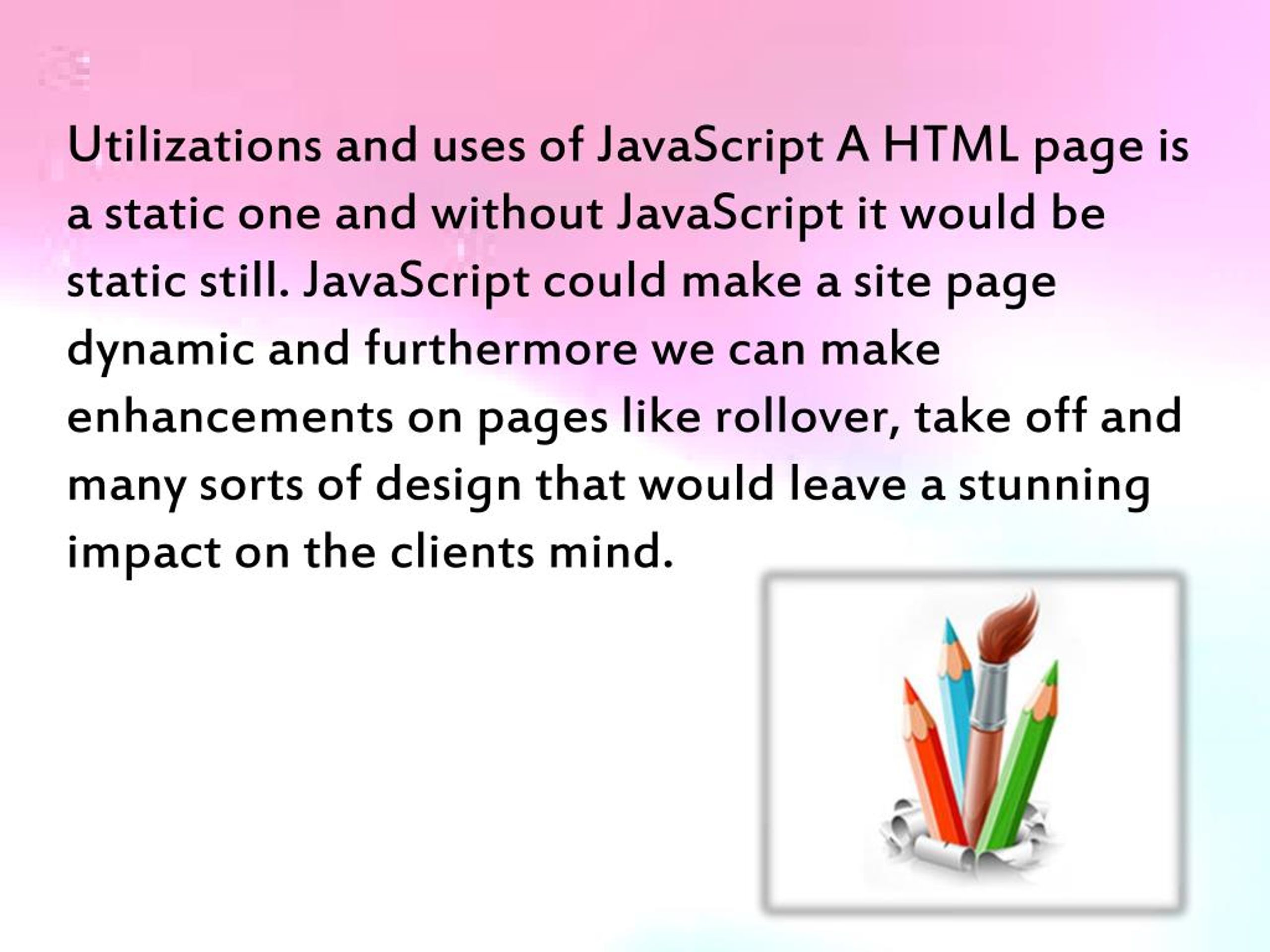 Utilizations and uses of JavaScript A HTML page is a static one and without JavaScript it would be static still. JavaScript could make a site page dynamic and furthermore we can make enhancements on pages like rollover, take off and many sorts of design that would leave a stunning impact on the clients mind.