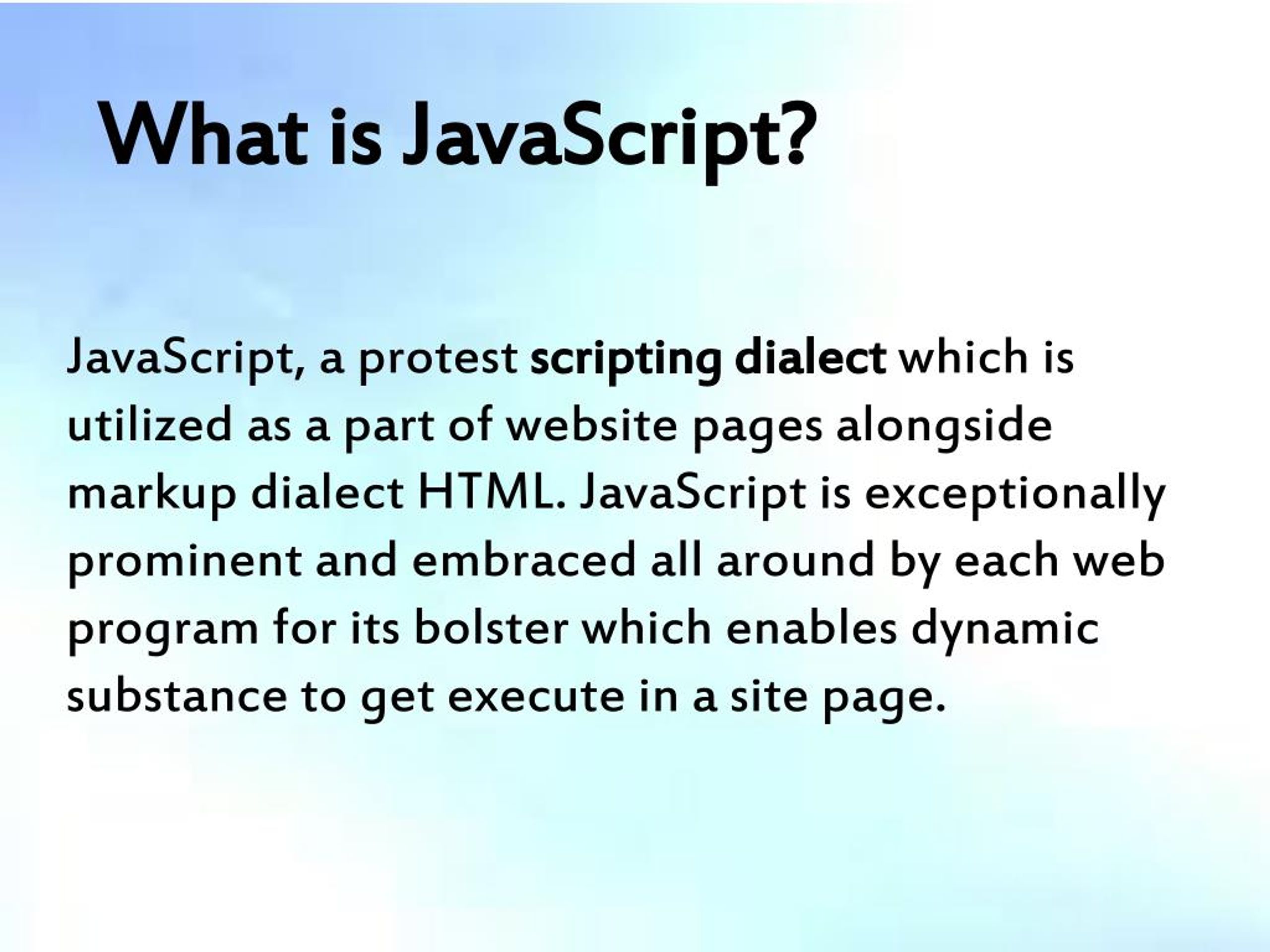 What is JavaScript? JavaScript, a protest scripting dialect which is utilized as a part of website pages alongside markup dialect HTML. JavaScript is exceptionally prominent and embraced all around by each web program for its bolster which enables dynamic substance to get execute in a site page.