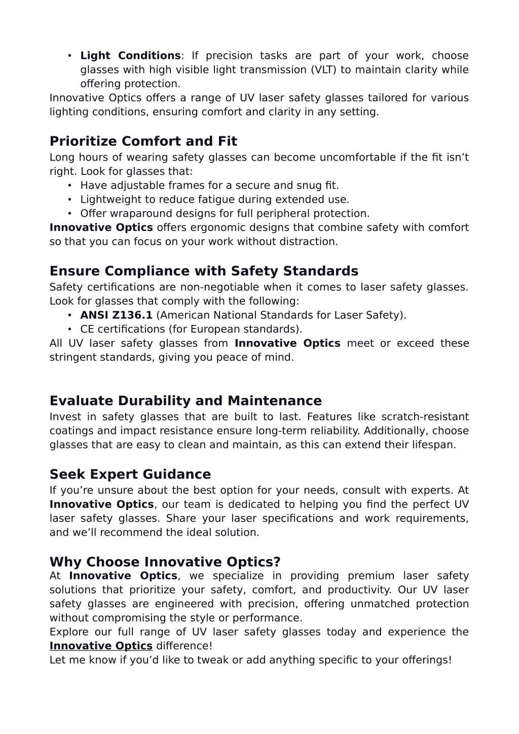 • Light Conditions: If precision tasks are part of your work, choose glasses with high visible light transmission (VLT) to maintain clarity while offering protection. Innovative Optics offers a range of UV laser safety glasses tailored for various lighting conditions, ensuring comfort and clarity in any setting. Prioritize Comfort and Fit Long hours of wearing safety glasses can become uncomfortable if the fit isn’t right. Look for glasses that: • Have adjustable frames for a secure and snug fit. • Lightweight to reduce fatigue during extended use. • Offer wraparound designs for full peripheral protection. Innovative Optics offers ergonomic designs that combine safety with comfort so that you can focus on your work without distraction. Ensure Compliance with Safety Standards Safety certifications are non-negotiable when it comes to laser safety glasses. Look for glasses that comply with the following: • ANSI Z136.1 (American National Standards for Laser Safety). • CE certifications (for European standards). All UV laser safety glasses from Innovative Optics meet or exceed these stringent standards, giving you peace of mind. Evaluate Durability and Maintenance Invest in safety glasses that are built to last. Features like scratch-resistant coatings and impact resistance ensure long-term reliability. Additionally, choose glasses that are easy to clean and maintain, as this can extend their lifespan. Seek Expert Guidance If you’re unsure about the best option for your needs, consult with experts. At Innovative Optics, our team is dedicated to helping you find the perfect UV laser safety glasses. Share your laser specifications and work requirements, and we’ll recommend the ideal solution. Why Choose Innovative Optics? At Innovative Optics, we specialize in providing premium laser safety solutions that prioritize your safety, comfort, and productivity. Our UV laser safety glasses are engineered with precision, offering unmatched protection without compromising the style or performance. Explore our full range of UV laser safety glasses today and experience the Innovative Optics difference! Let me know if you’d like to tweak or add anything specific to your offerings!
