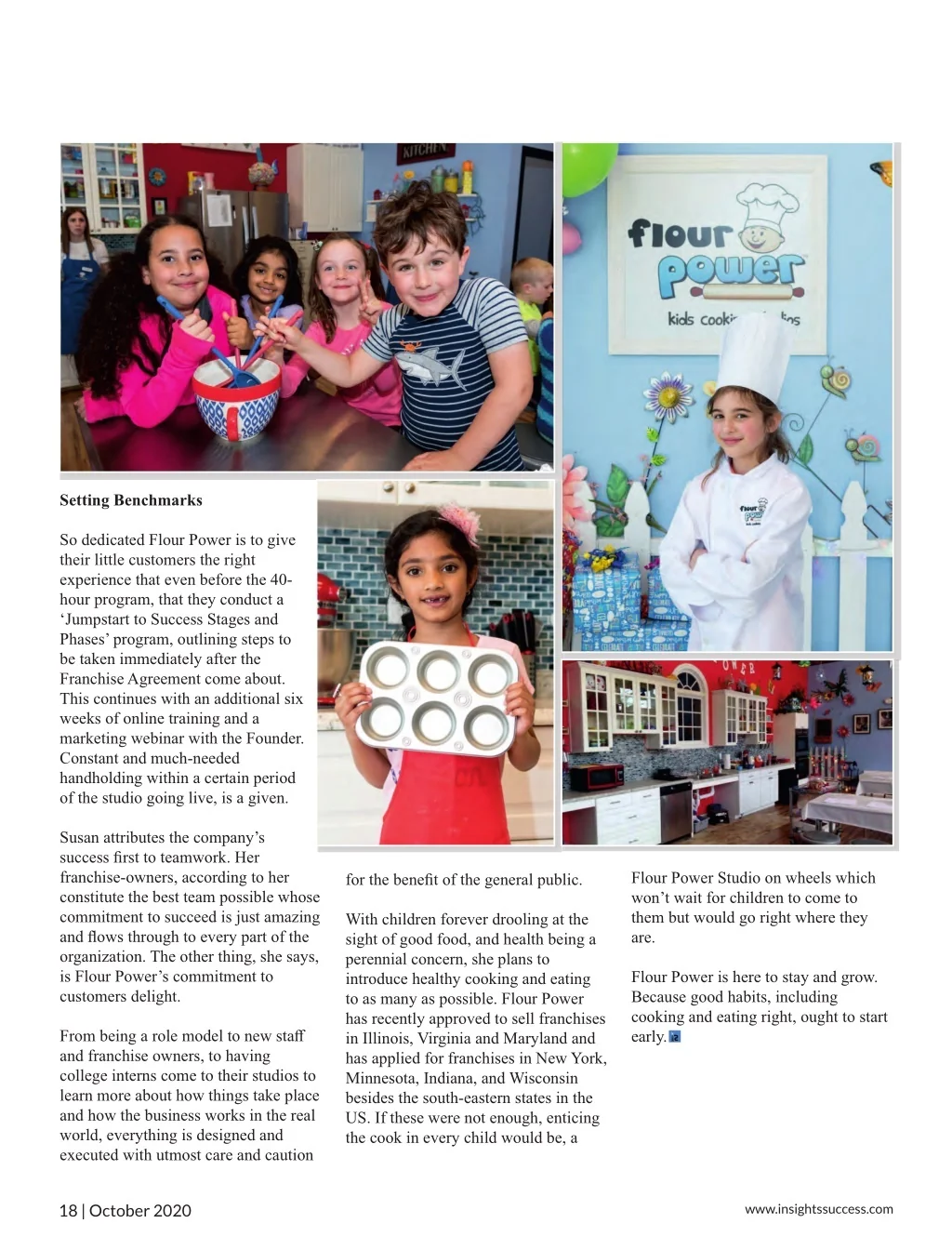 S 19 years in the US: ample these statistics about obesity in children and adolescents aged between 2 and - At 18.5% it affects close to 13.7 million children and adolescents. - At 13.9% among 2 to 5-year-olds, 18.4% among 6 to 11-year-olds, and 20.6% among 12 to 19-year-olds. (source: https://www.cdc.gov/obesity/ data/childhood.html. Page last reviewed: June 24, 2019) Susan Caldwell, Founder and CEO at FlourPower knew all about these too well, as also the struggles that go into getting out of obesity and getting into shape. She should. After all she did feature in People Magazine’s Annual “Half Their Size” issue having lost over 150 pounds. But then unlike others who bask in the glow of an achievement of a lifetime, she did something different, and profound! She began a youth fitness program to teach children about being healthy, which included cooking healthy. What began in 2008 from a single location in Raleigh, grew organically to four corporate locations before farming out franchises in the year 2016. Today, Flour Power is paving its way ahead with 15 franchises in 7 states across the US. The most interesting part in its rise remains the fact that it all started in a gym. “ Flour Power Kids Cooking Studios Where Health and Learning Conjoin From being a role model to new staff and franchise owners, to having college interns in the studios learning how the studio operates and how the business world works, everything we do is done with commitment, and the customer in mind. ” 16 | October 2020 www.insightssuccess.com