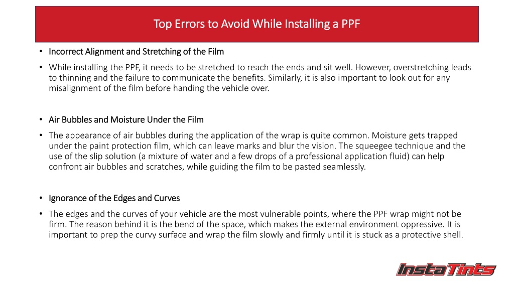6. Top Errors to Avoid While Installing a PPF • Incorrect Alignment and Stretching of the Film • While installing the PPF, it needs to be stretched to reach the ends and sit well. However, overstretching leads to thinning and the failure to communicate the benefits. Similarly, it is also important to look out for any misalignment of the film before handing the vehicle over. • Air Bubbles and Moisture Under the Film • The appearance of air bubbles during the application of the wrap is quite common. Moisture gets trapped under the paint protection film, which can leave marks and blur the vision. The squeegee technique and the use of the slip solution (a mixture of water and a few drops of a professional application fluid) can help confront air bubbles and scratches, while guiding the film to be pasted seamlessly. • Ignorance of the Edges and Curves • The edges and the curves of your vehicle are the most vulnerable points, where the PPF wrap might not be firm. The reason behind it is the bend of the space, which makes the external environment oppressive. It is important to prep the curvy surface and wrap the film slowly and firmly until it is stuck as a protective shell.