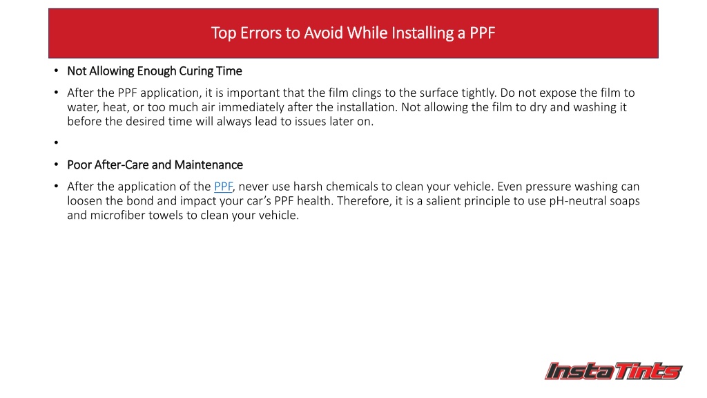 7. Top Errors to Avoid While Installing a PPF • Not Allowing Enough Curing Time • After the PPF application, it is important that the film clings to the surface tightly. Do not expose the film to water, heat, or too much air immediately after the installation. Not allowing the film to dry and washing it before the desired time will always lead to issues later on. • Poor After-Care and Maintenance • After the application of the PPF, never use harsh chemicals to clean your vehicle. Even pressure washing can loosen the bond and impact your car’s PPF health. Therefore, it is a salient principle to use pH-neutral soaps and microfiber towels to clean your vehicle.