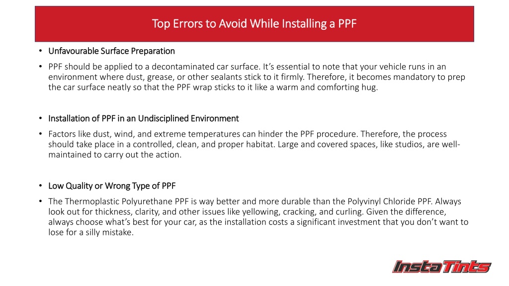 5. Top Errors to Avoid While Installing a PPF • Unfavourable Surface Preparation • PPF should be applied to a decontaminated car surface. It’s essential to note that your vehicle runs in an environment where dust, grease, or other sealants stick to it firmly. Therefore, it becomes mandatory to prep the car surface neatly so that the PPF wrap sticks to it like a warm and comforting hug. • Installation of PPF in an Undisciplined Environment • Factors like dust, wind, and extreme temperatures can hinder the PPF procedure. Therefore, the process should take place in a controlled, clean, and proper habitat. Large and covered spaces, like studios, are well-maintained to carry out the action. • Low Quality or Wrong Type of PPF • The Thermoplastic Polyurethane PPF is way better and more durable than the Polyvinyl Chloride PPF. Always look out for thickness, clarity, and other issues like yellowing, cracking, and curling. Given the difference, always choose what’s best for your car, as the installation costs a significant investment that you don’t want to lose for a silly mistake.