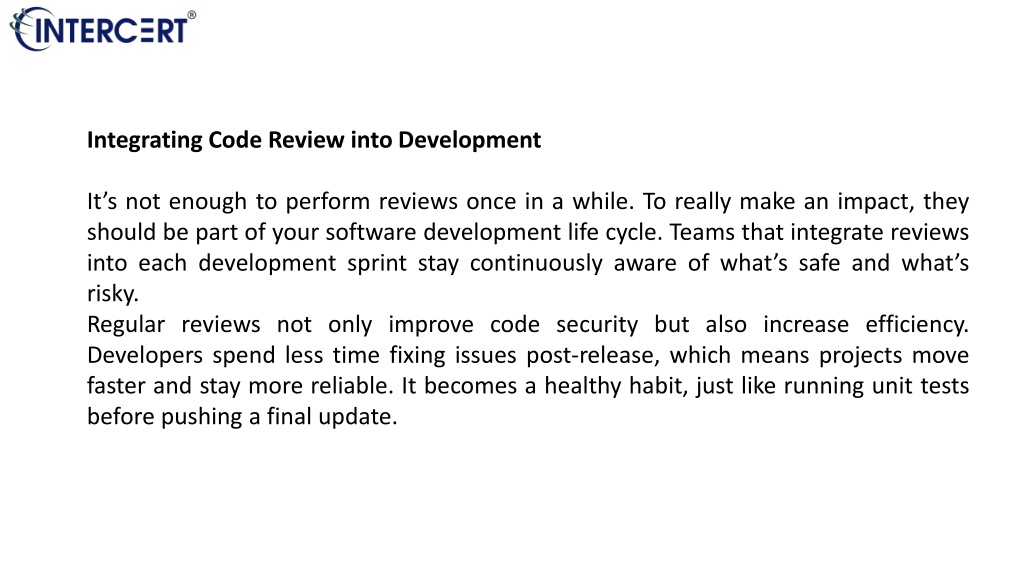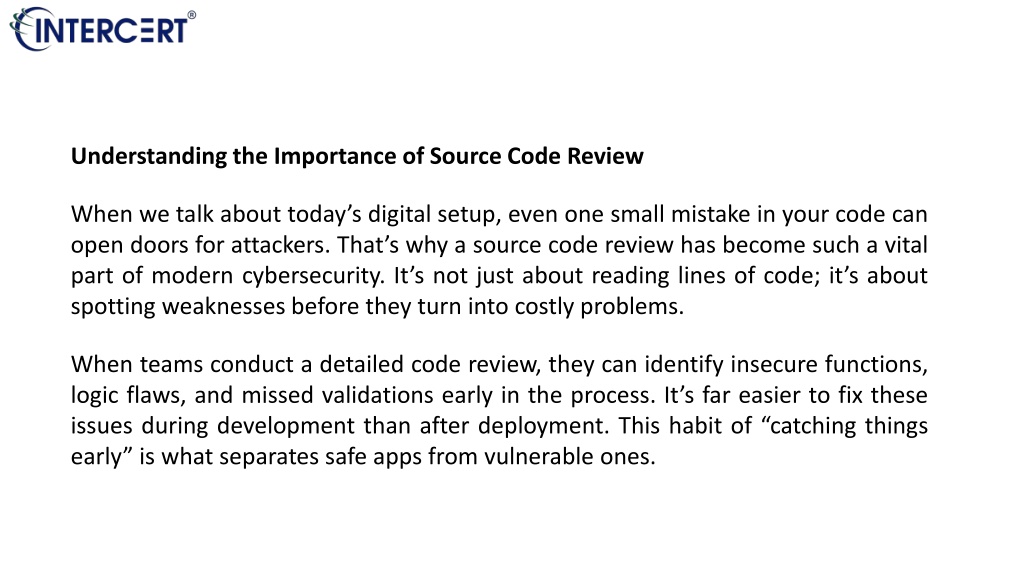 6. Partnering for Better Security Getting started with secure code review might sound complex at first, but that’s where expert guidance helps. Working with professional cybersecurity teams ensures your code is reviewed with both automation and deep manual insight. This balance helps detect even the subtle vulnerabilities others might overlook. If your organization also requires a source code review, then you should opt for INTERCERT, a trusted and independent audit body. INTERCERTconducts a detailed source code review as part of its comprehensive security testing. After the assessment, they provide reporting and remediation, and this approach identifies weak spots early and manages risks better. This maintains compliance with international standards, making your applications stronger and far safer in the long run.
