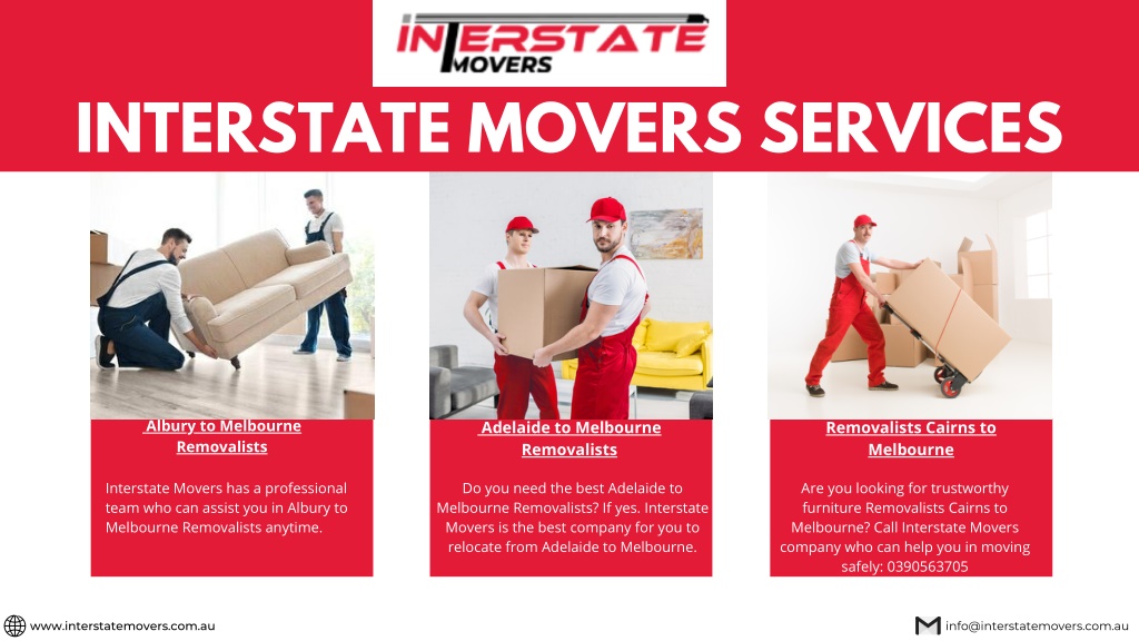 INTERSTATE MOVERS SERVICES Albury to Melbourne Removalists Adelaide to Melbourne Removalists Removalists Cairns to Melbourne Interstate Movers has a professional team who can assist you in Albury to Melbourne Removalists anytime. Do you need the best Adelaide to Melbourne Removalists? If yes. Interstate Movers is the best company for you to relocate from Adelaide to Melbourne. Are you looking for trustworthy furniture Removalists Cairns to Melbourne? Call Interstate Movers company who can help you in moving safely: 0390563705 www.interstatemovers.com.au info@interstatemovers.com.au