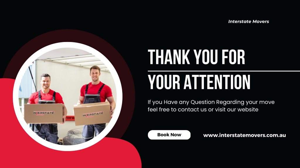 Interstate Movers THANK YOU FOR YOUR ATTENTION If you Have any Question Regarding your move feel free to contact us or visit our website Book Now www.interstatemovers.com.au