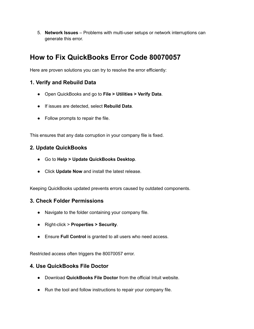 5. Network Issues – Problems with multi-user setups or network interruptions can generate this error. How to Fix QuickBooks Error Code 80070057 Here are proven solutions you can try to resolve the error efficiently: 1. Verify and Rebuild Data ● Open QuickBooks and go to File > Utilities > Verify Data. ● If issues are detected, select Rebuild Data. ● Follow prompts to repair the file. This ensures that any data corruption in your company file is fixed. 2. Update QuickBooks ● Go to Help > Update QuickBooks Desktop. ● Click Update Now and install the latest release. Keeping QuickBooks updated prevents errors caused by outdated components. 3. Check Folder Permissions ● Navigate to the folder containing your company file. ● Right-click > Properties > Security. ● Ensure Full Control is granted to all users who need access. Restricted access often triggers the 80070057 error. 4. Use QuickBooks File Doctor ● Download QuickBooks File Doctor from the official Intuit website. ● Run the tool and follow instructions to repair your company file.