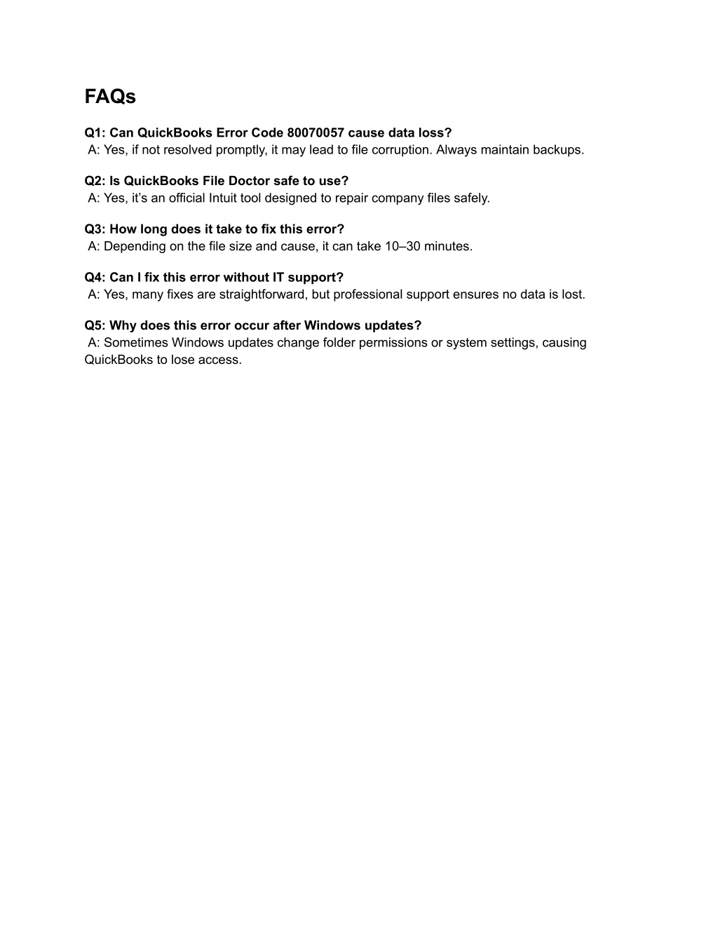 FAQs Q1: Can QuickBooks Error Code 80070057 cause data loss? A: Yes, if not resolved promptly, it may lead to file corruption. Always maintain backups. Q2: Is QuickBooks File Doctor safe to use? A: Yes, it’s an official Intuit tool designed to repair company files safely. Q3: How long does it take to fix this error? A: Depending on the file size and cause, it can take 10–30 minutes. Q4: Can I fix this error without IT support? A: Yes, many fixes are straightforward, but professional support ensures no data is lost. Q5: Why does this error occur after Windows updates? A: Sometimes Windows updates change folder permissions or system settings, causing QuickBooks to lose access.