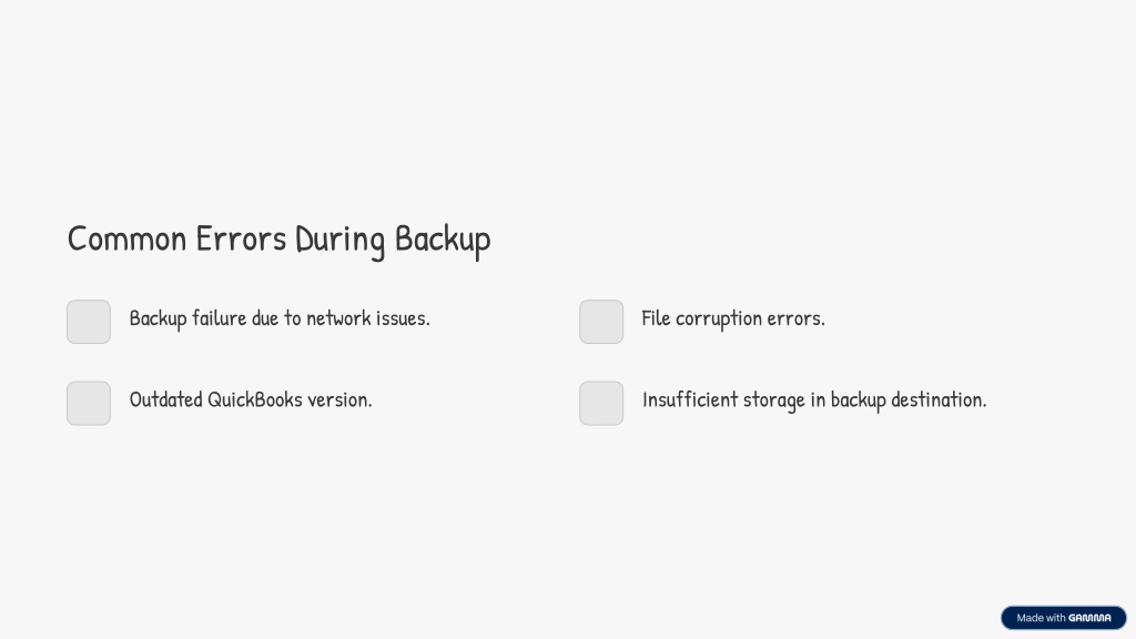 Common Errors During Backup Backup failure due to network issues. File corruption errors. Outdated QuickBooks version. Insufficient storage in backup destination.