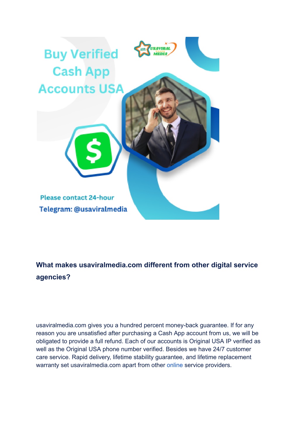 What makes usaviralmedia.com different from other digital service agencies? usaviralmedia.com gives you a hundred percent money-back guarantee. If for any reason you are unsatisfied after purchasing a Cash App account from us, we will be obligated to provide a full refund. Each of our accounts is Original USA IP verified as well as the Original USA phone number verified. Besides we have 24/7 customer care service. Rapid delivery, lifetime stability guarantee, and lifetime replacement warranty set usaviralmedia.com apart from other online service providers.