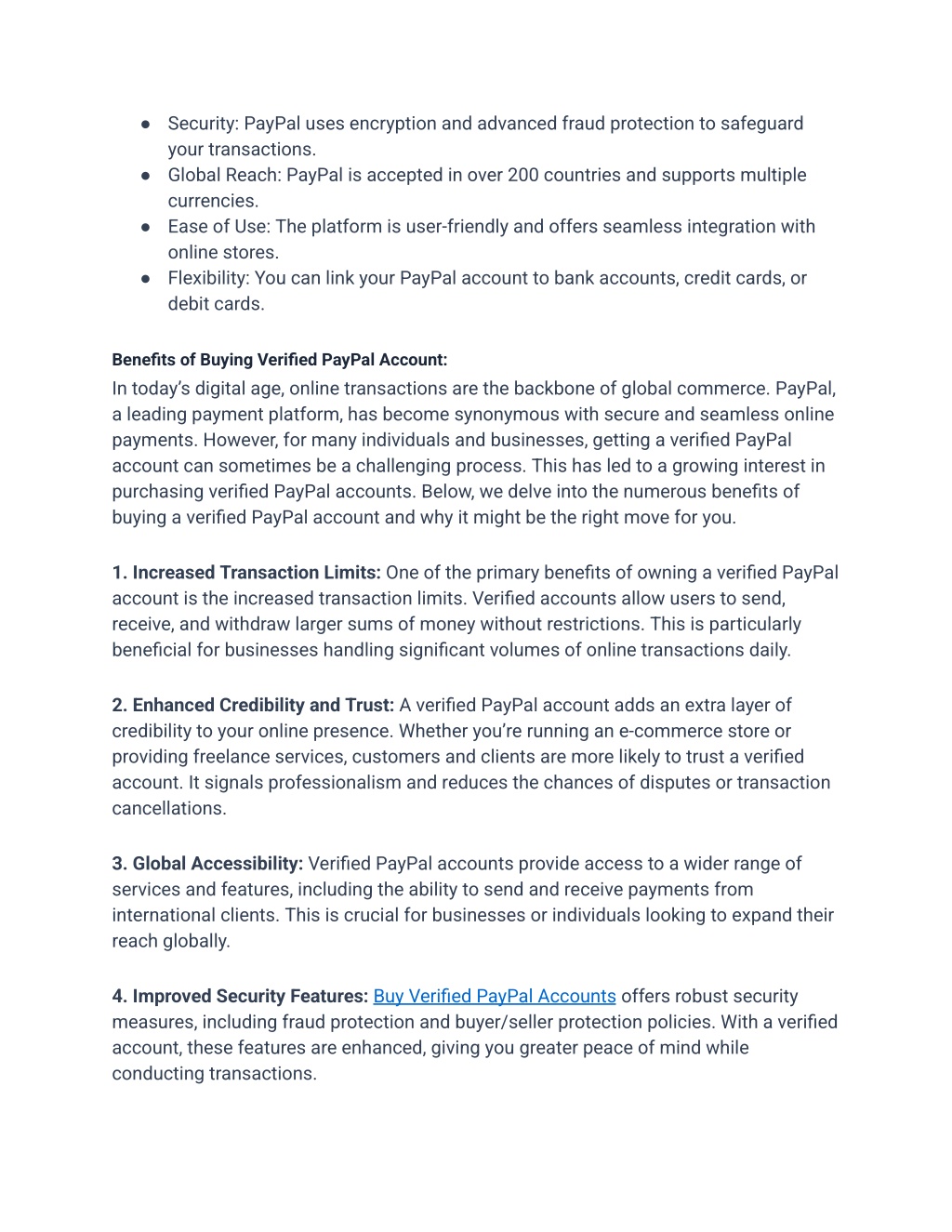 ● Security: PayPal uses encryption and advanced fraud protection to safeguard your transactions. ● Global Reach: PayPal is accepted in over 200 countries and supports multiple currencies. ● Ease of Use: The platform is user-friendly and offers seamless integration with online stores. ● Flexibility: You can link your PayPal account to bank accounts, credit cards, or debit cards. Benefits of Buying Verified PayPal Account: In today’s digital age, online transactions are the backbone of global commerce. PayPal, a leading payment platform, has become synonymous with secure and seamless online payments. However, for many individuals and businesses, getting a verified PayPal account can sometimes be a challenging process. This has led to a growing interest in purchasing verified PayPal accounts. Below, we delve into the numerous benefits of buying a verified PayPal account and why it might be the right move for you. 1. Increased Transaction Limits: One of the primary benefits of owning a verified PayPal account is the increased transaction limits. Verified accounts allow users to send, receive, and withdraw larger sums of money without restrictions. This is particularly beneficial for businesses handling significant volumes of online transactions daily. 2. Enhanced Credibility and Trust: A verified PayPal account adds an extra layer of credibility to your online presence. Whether you’re running an e-commerce store or providing freelance services, customers and clients are more likely to trust a verified account. It signals professionalism and reduces the chances of disputes or transaction cancellations. 3. Global Accessibility: Verified PayPal accounts provide access to a wider range of services and features, including the ability to send and receive payments from international clients. This is crucial for businesses or individuals looking to expand their reach globally. 4. Improved Security Features: Buy Verified PayPal Accounts offers robust security measures, including fraud protection and buyer/seller protection policies. With a verified account, these features are enhanced, giving you greater peace of mind while conducting transactions.