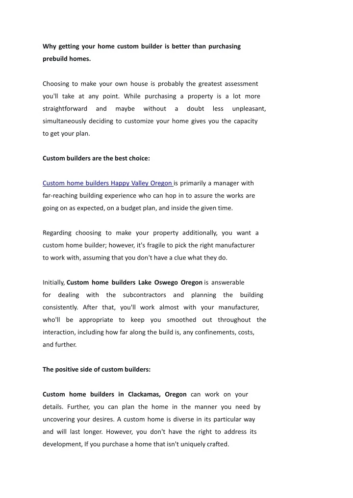Whygettingyourhomecustombuilderisbetterthanpurchasing prebuild homes. Choosingtomakeyourownhouseisprobablythegreatestassessment you'lltakeatanypoint.Whilepurchasingapropertyisalotmore straightforwardandmaybewithoutadoubtlessunpleasant, simultaneouslydecidingtocustomizeyourhomegivesyouthecapacity to get your plan. Custom builders are the best choice: CustomhomebuildersHappyValleyOregon isprimarilyamanagerwith far-reachingbuildingexperiencewhocanhopintoassuretheworksare going on as expected, on a budget plan, and inside the given time. Regardingchoosingtomakeyourpropertyadditionally,youwanta customhomebuilder;however,it'sfragiletopicktherightmanufacturer to work with, assuming that you don't have a clue what they do. Initially, CustomhomebuildersLakeOswegoOregonisanswerable fordealingwiththesubcontractorsandplanningthebuilding consistently.Afterthat,you'llworkalmostwithyourmanufacturer, who'llbeappropriatetokeepyousmoothedoutthroughoutthe interaction,includinghowfaralongthebuildis,anyconfinements,costs, and further. The positive side of custom builders: CustomhomebuildersinClackamas,Oregoncanworkonyour details.Further,youcanplanthehomeinthemanneryouneedby uncoveringyourdesires.Acustomhomeisdiverseinitsparticularway andwilllastlonger.However,youdon'thavetherighttoaddressits development, If you purchase a home that isn't uniquely crafted.