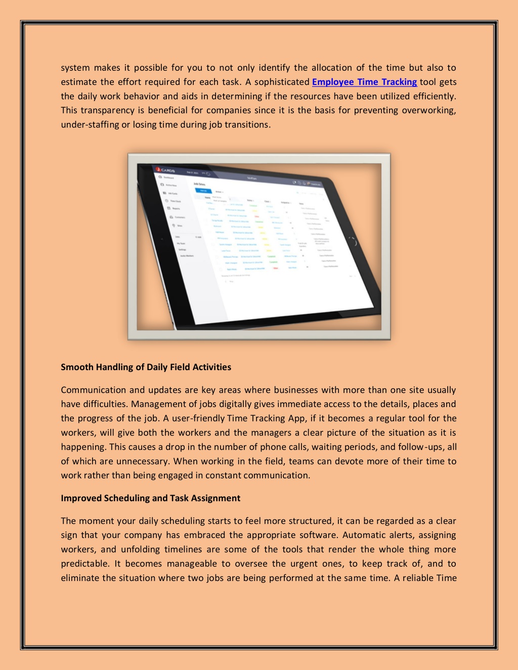 system makes it possible for you to not only identify the allocation of the time but also to estimate the effort required for each task. A sophisticated Employee Time Tracking tool gets the daily work behavior and aids in determining if the resources have been utilized efficiently. This transparency is beneficial for companies since it is the basis for preventing overworking, under-staffing or losing time during job transitions. Smooth Handling of Daily Field Activities Communication and updates are key areas where businesses with more than one site usually have difficulties. Management of jobs digitally gives immediate access to the details, places and the progress of the job. A user-friendly Time Tracking App, if it becomes a regular tool for the workers, will give both the workers and the managers a clear picture of the situation as it is happening. This causes a drop in the number of phone calls, waiting periods, and follow-ups, all of which are unnecessary. When working in the field, teams can devote more of their time to work rather than being engaged in constant communication. Improved Scheduling and Task Assignment The moment your daily scheduling starts to feel more structured, it can be regarded as a clear sign that your company has embraced the appropriate software. Automatic alerts, assigning workers, and unfolding timelines are some of the tools that render the whole thing more predictable. It becomes manageable to oversee the urgent ones, to keep track of, and to eliminate the situation where two jobs are being performed at the same time. A reliable Time