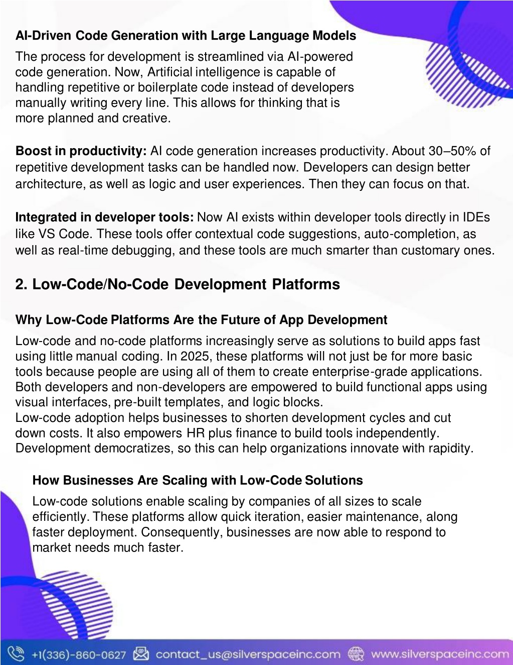 Improved compliance: Automated audits as well as real-time logs improve compliance to help teams meet regulatory requirements. Therefore, teams do not have to track each and every change manually. • Stronger collaboration: Through stronger collaboration, DevSecOps closes the divide between security and engineering teams because they align goals and share responsibility for secure outcomes. Conclusion A major transformation is underway in the software development field in 2025. LLMs and Artificial Intelligence increase output. They also change how code gets written. Low-code/no-code platforms can innovate at a faster rate by enabling a faster and more accessible method for app development. Current apps need scale and flexibility. It is being furnished by cloud-native architecture plus microservices. DevSecOps is to ensure that every project will have secure development as an integral part right from the start. These trends do matter for developers and for businesses alike. Indeed, to remain ahead of them provides a competitive advantage to you. Building more powerful, scalable as well as secure digital experiences will see those adapting quickly leading that charge. At Silverspace Inc., our developers use new trends for IT services that are ready for the future, helping our clients succeed within a market that changes fast. We believe in staying current so we can help you stay ahead. Curious to learn more? Explore our blogs to stay informed about the latest technologies and trends that are shaping the world in 2025 and beyond. Stay curious. Stay updated. The future of software is already here, 2025 is just the beginning.