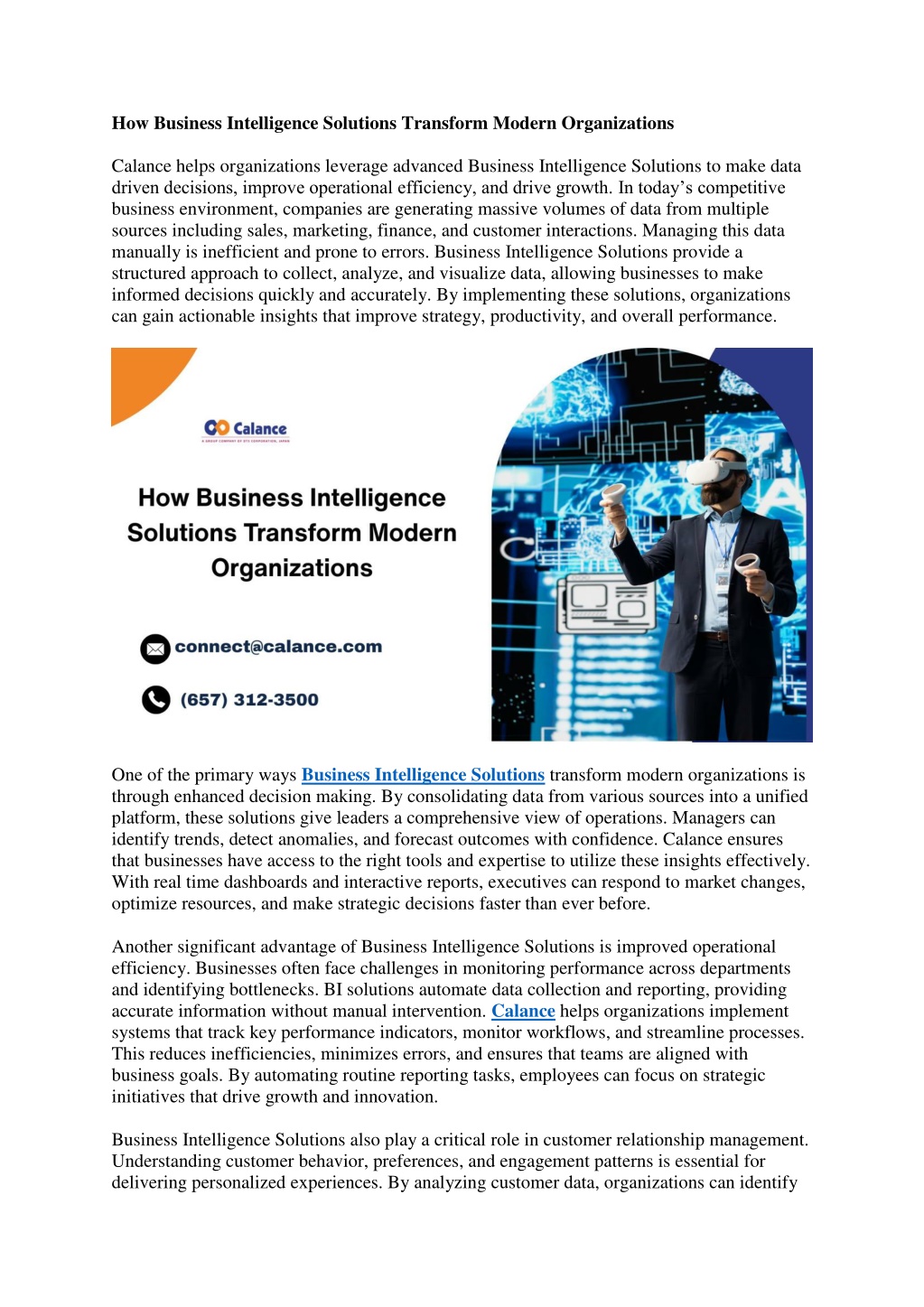 1. How Business Intelligence Solutions Transform Modern Organizations Calance helps organizations leverage advanced Business Intelligence Solutions to make data driven decisions, improve operational efficiency, and drive growth. In today’s competitive business environment, companies are generating massive volumes of data from multiple sources including sales, marketing, finance, and customer interactions. Managing this data manually is inefficient and prone to errors. Business Intelligence Solutions provide a structured approach to collect, analyze, and visualize data, allowing businesses to make informed decisions quickly and accurately. By implementing these solutions, organizations can gain actionable insights that improve strategy, productivity, and overall performance. One of the primary ways Business Intelligence Solutions transform modern organizations is through enhanced decision making. By consolidating data from various sources into a unified platform, these solutions give leaders a comprehensive view of operations. Managers can identify trends, detect anomalies, and forecast outcomes with confidence. Calance ensures that businesses have access to the right tools and expertise to utilize these insights effectively. With real time dashboards and interactive reports, executives can respond to market changes, optimize resources, and make strategic decisions faster than ever before. Another significant advantage of Business Intelligence Solutions is improved operational efficiency. Businesses often face challenges in monitoring performance across departments and identifying bottlenecks. BI solutions automate data collection and reporting, providing accurate information without manual intervention. Calance helps organizations implement systems that track key performance indicators, monitor workflows, and streamline processes. This reduces inefficiencies, minimizes errors, and ensures that teams are aligned with business goals. By automating routine reporting tasks, employees can focus on strategic initiatives that drive growth and innovation. Business Intelligence Solutions also play a critical role in customer relationship management. Understanding customer behavior, preferences, and engagement patterns is essential for delivering personalized experiences. By analyzing customer data, organizations can identify