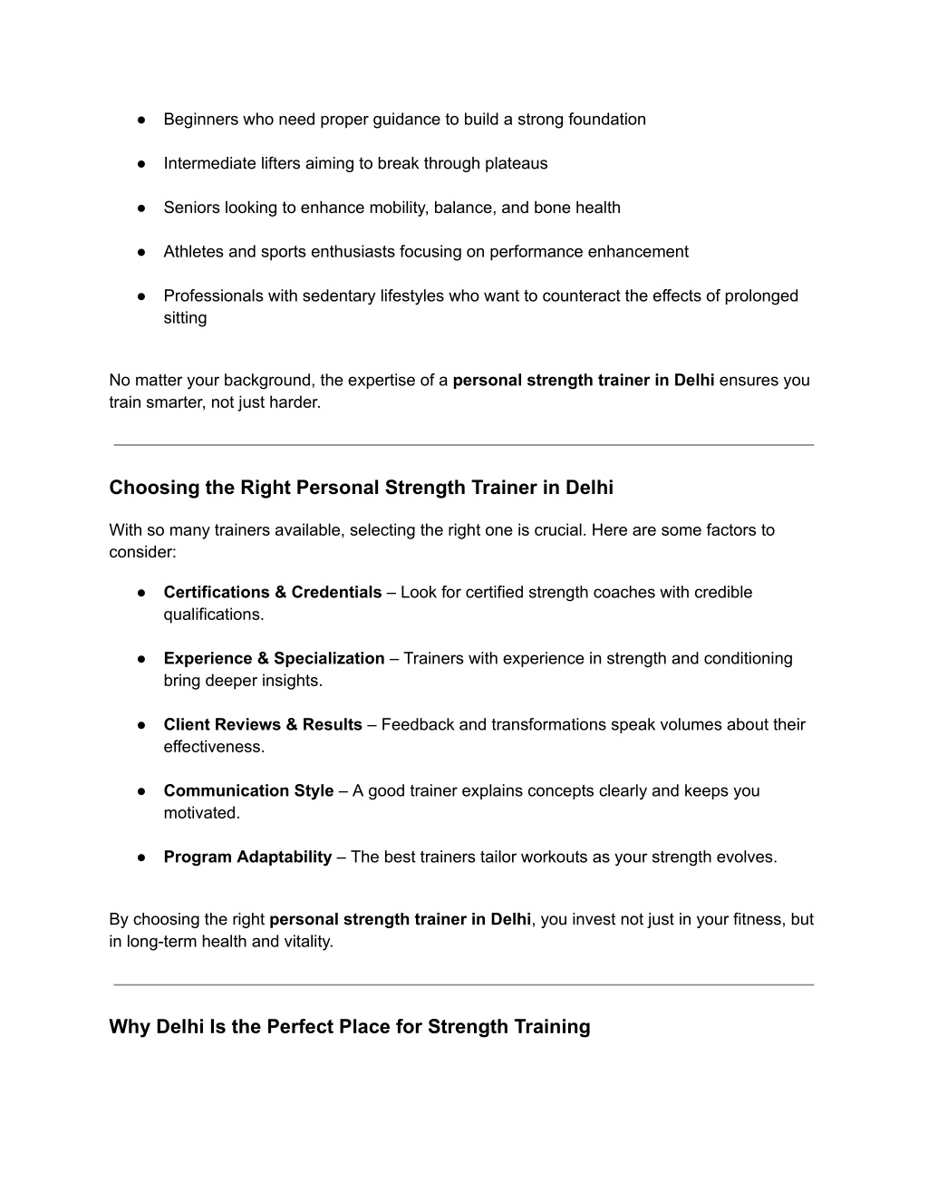 ● Beginners who need proper guidance to build a strong foundation ● Intermediate lifters aiming to break through plateaus ● Seniors looking to enhance mobility, balance, and bone health ● Athletes and sports enthusiasts focusing on performance enhancement ● Professionals with sedentary lifestyles who want to counteract the effects of prolonged sitting No matter your background, the expertise of a personal strength trainer in Delhi ensures you train smarter, not just harder. Choosing the Right Personal Strength Trainer in Delhi With so many trainers available, selecting the right one is crucial. Here are some factors to consider: ● Certifications & Credentials – Look for certified strength coaches with credible qualifications. ● Experience & Specialization – Trainers with experience in strength and conditioning bring deeper insights. ● Client Reviews & Results – Feedback and transformations speak volumes about their effectiveness. ● Communication Style – A good trainer explains concepts clearly and keeps you motivated. ● Program Adaptability – The best trainers tailor workouts as your strength evolves. By choosing the right personal strength trainer in Delhi, you invest not just in your fitness, but in long-term health and vitality. Why Delhi Is the Perfect Place for Strength Training