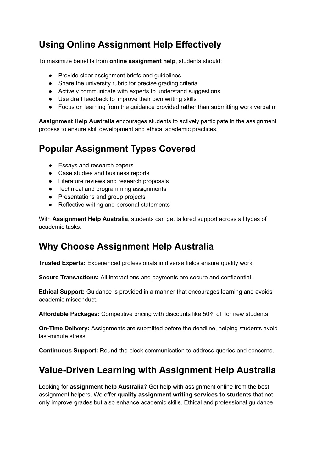 Using Online Assignment Help Effectively To maximize benefits from online assignment help, students should: ● Provide clear assignment briefs and guidelines ● Share the university rubric for precise grading criteria ● Actively communicate with experts to understand suggestions ● Use draft feedback to improve their own writing skills ● Focus on learning from the guidance provided rather than submitting work verbatim Assignment Help Australia encourages students to actively participate in the assignment process to ensure skill development and ethical academic practices. Popular Assignment Types Covered ● Essays and research papers ● Case studies and business reports ● Literature reviews and research proposals ● Technical and programming assignments ● Presentations and group projects ● Reflective writing and personal statements With Assignment Help Australia, students can get tailored support across all types of academic tasks. Why Choose Assignment Help Australia Trusted Experts: Experienced professionals in diverse fields ensure quality work. Secure Transactions: All interactions and payments are secure and confidential. Ethical Support: Guidance is provided in a manner that encourages learning and avoids academic misconduct. Affordable Packages: Competitive pricing with discounts like 50% off for new students. On-Time Delivery: Assignments are submitted before the deadline, helping students avoid last-minute stress. Continuous Support: Round-the-clock communication to address queries and concerns. Value-Driven Learning with Assignment Help Australia Looking for assignment help Australia? Get help with assignment online from the best assignment helpers. We offer quality assignment writing services to students that not only improve grades but also enhance academic skills. Ethical and professional guidance