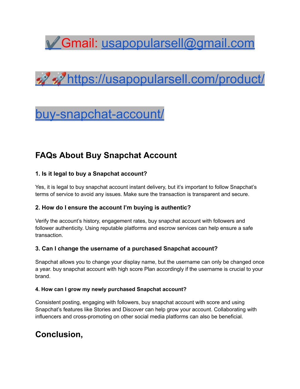 ✔Gmail:usapopularsell@gmail.com ??https://usapopularsell.com/product/ buy-snapchat-account/ FAQs About Buy Snapchat Account 1. Is it legal to buy a Snapchat account? Yes, it is legal to buy snapchat account instant delivery, but it’s important to follow Snapchat’s terms of service to avoid any issues. Make sure the transaction is transparent and secure. 2. How do I ensure the account I’m buying is authentic? Verify the account’s history, engagement rates, buy snapchat account with followers and follower authenticity. Using reputable platforms and escrow services can help ensure a safe transaction. 3. Can I change the username of a purchased Snapchat account? Snapchat allows you to change your display name, but the username can only be changed once a year. buy snapchat account with high score Plan accordingly if the username is crucial to your brand. 4. How can I grow my newly purchased Snapchat account? Consistent posting, engaging with followers, buy snapchat account with score and using Snapchat’s features like Stories and Discover can help grow your account. Collaborating with influencers and cross-promoting on other social media platforms can also be beneficial. Conclusion,