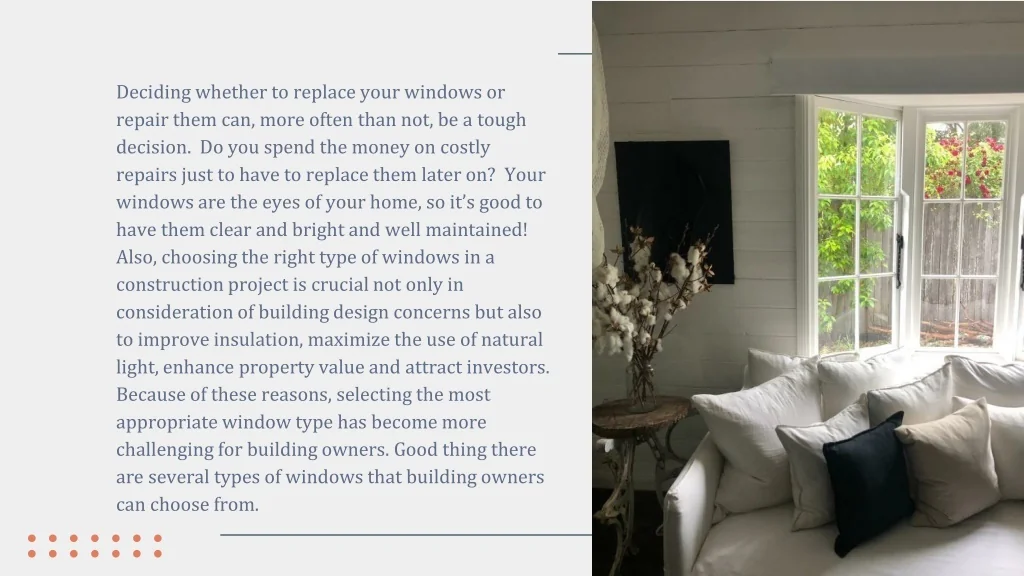 Deciding whether to replace your windows or repair them can, more often than not, be a tough decision. Do you spend the money on costly repairs just to have to replace them later on? Your windows are the eyes of your home, so it’s good to have them clear and bright and well maintained! Also, choosing the right type of windows in a construction project is crucial not only in consideration of building design concerns but also to improve insulation, maximize the use of natural light, enhance property value and attract investors. Because of these reasons, selecting the most appropriate window type has become more challenging for building owners. Good thing there are several types of windows that building owners can choose from.