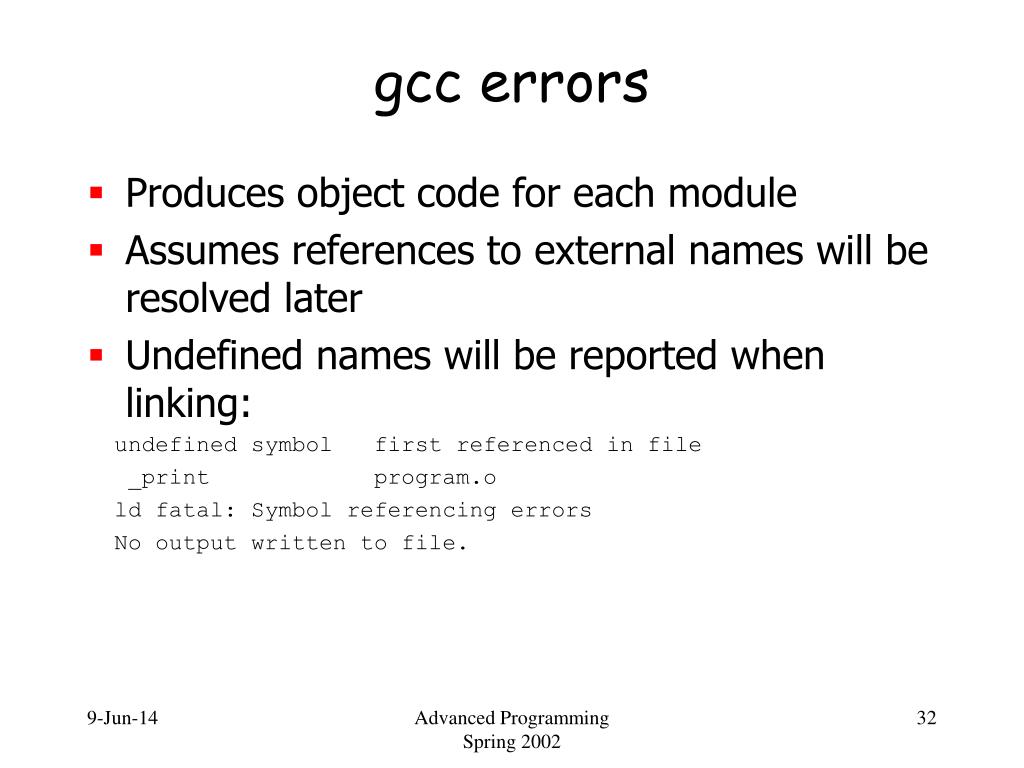 gcc errors • Produces object code for each module • Assumes references to external names will be resolved later • Undefined names will be reported when linking: undefined symbol first referenced in file _print program.o ld fatal: Symbol referencing errors No output written to file. Advanced Programming Spring 2002