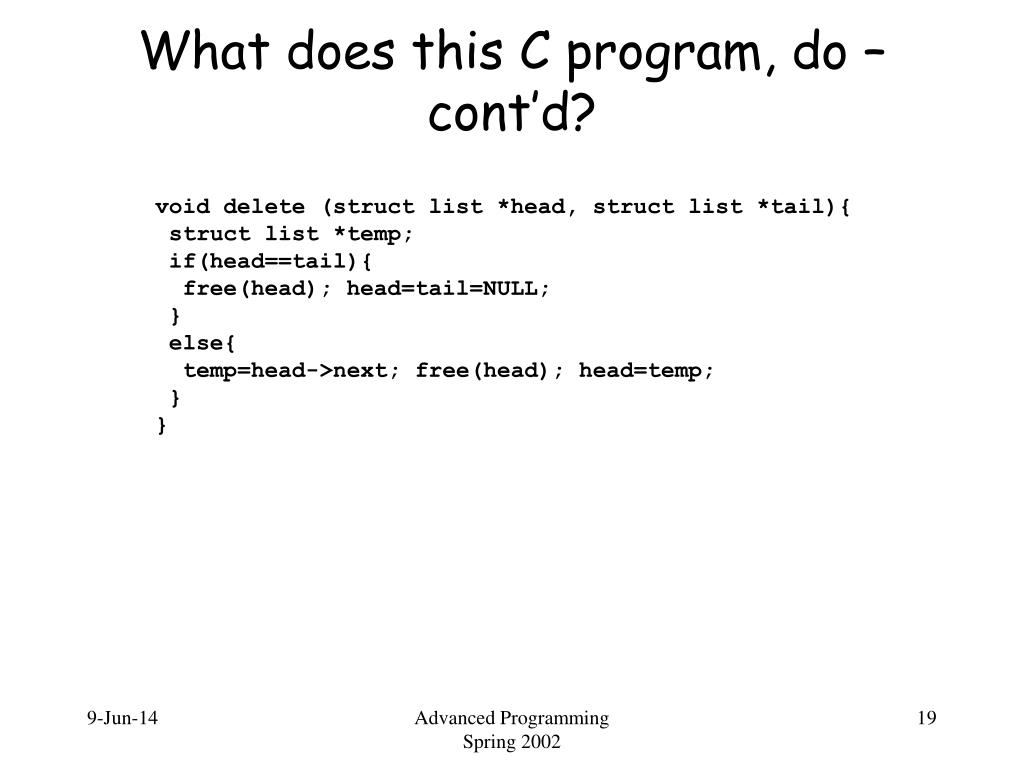 void delete (struct list *head, struct list *tail){ struct list *temp; if(head==tail){ free(head); head=tail=NULL; } else{ temp=head->next; free(head); head=temp; } } What does this C program, do – cont’d? Advanced Programming Spring 2002