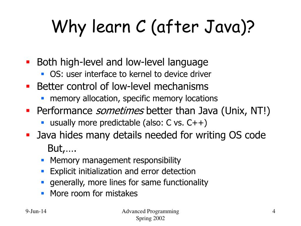 Why learn C (after Java)? • Both high-level and low-level language • OS: user interface to kernel to device driver • Better control of low-level mechanisms • memory allocation, specific memory locations • Performance sometimes better than Java (Unix, NT!) • usually more predictable (also: C vs. C++) • Java hides many details needed for writing OS code But,…. • Memory management responsibility • Explicit initialization and error detection • generally, more lines for same functionality • More room for mistakes Advanced Programming Spring 2002