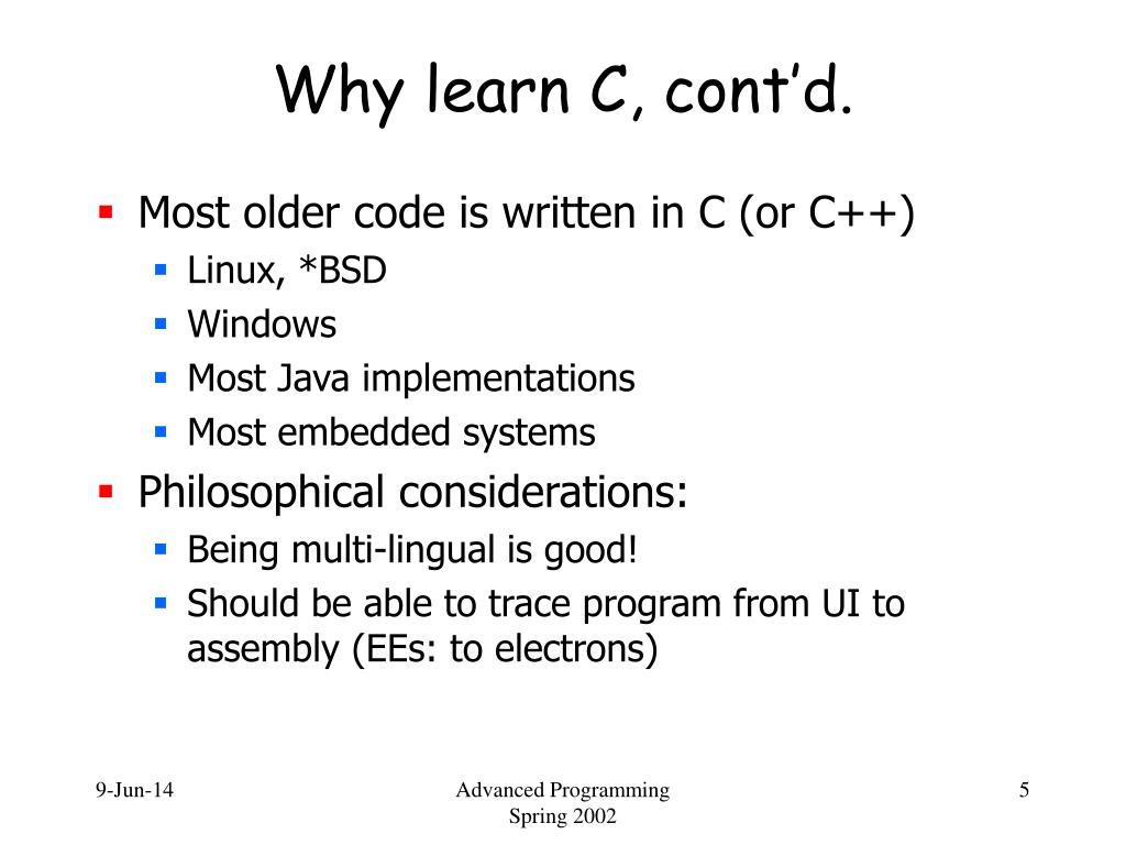 Why learn C, cont’d. • Most older code is written in C (or C++) • Linux, *BSD • Windows • Most Java implementations • Most embedded systems • Philosophical considerations: • Being multi-lingual is good! • Should be able to trace program from UI to assembly (EEs: to electrons) Advanced Programming Spring 2002