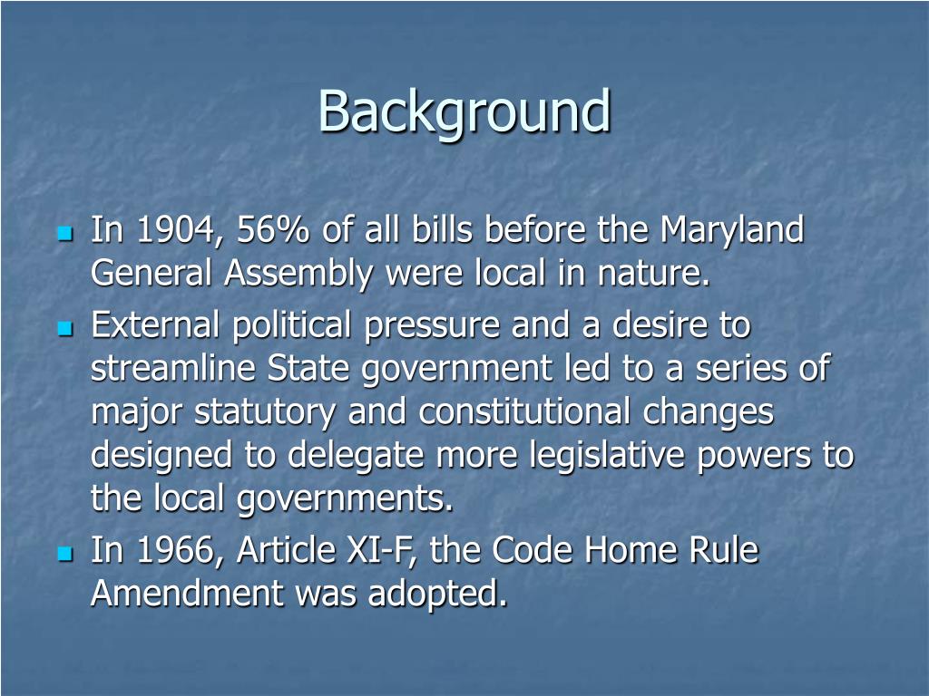 Background • In 1904, 56% of all bills before the Maryland General Assembly were local in nature. • External political pressure and a desire to streamline State government led to a series of major statutory and constitutional changes designed to delegate more legislative powers to the local governments. • In 1966, Article XI-F, the Code Home Rule Amendment was adopted.