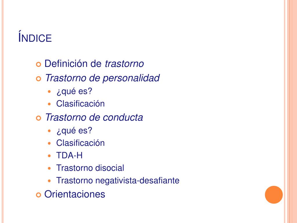 Índice • Definición de trastorno • Trastorno de personalidad • ¿qué es? • Clasificación • Trastorno de conducta • ¿qué es? • Clasificación • TDA-H • Trastorno disocial • Trastorno negativista-desafiante • Orientaciones
