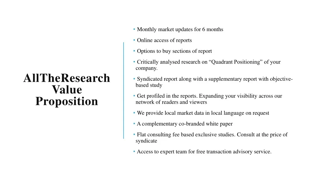 AllTheResearch Value Proposition • Monthly market updates for 6 months • Online access of reports • Options to buy sections of report • Critically analysed research on “Quadrant Positioning” of your company. • Syndicated report along with a supplementary report with objective-based study • Get profiled in the reports. Expanding your visibility across our network of readers and viewers • We provide local market data in local language on request • A complementary co-branded white paper • Flat consulting fee based exclusive studies. Consult at the price of syndicate • Access to expert team for free transaction advisory service.