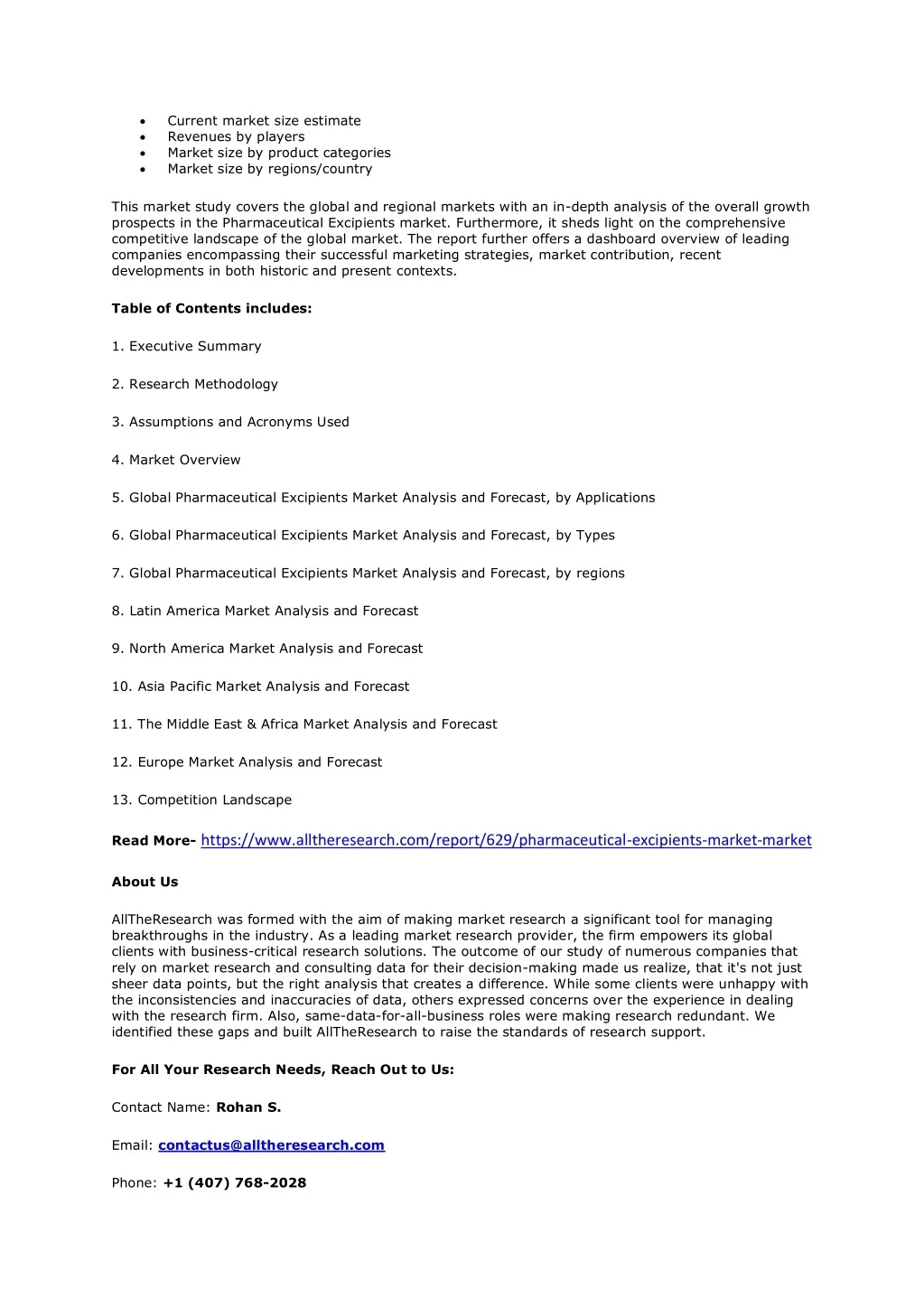 Current market size estimate Revenues by players Market size by product categories Market size by regions/country This market study covers the global and regional markets with an in-depth analysis of the overall growth prospects in the Pharmaceutical Excipients market. Furthermore, it sheds light on the comprehensive competitive landscape of the global market. The report further offers a dashboard overview of leading companies encompassing their successful marketing strategies, market contribution, recent developments in both historic and present contexts. Table of Contents includes: 1. Executive Summary 2. Research Methodology 3. Assumptions and Acronyms Used 4. Market Overview 5. Global Pharmaceutical Excipients Market Analysis and Forecast, by Applications 6. Global Pharmaceutical Excipients Market Analysis and Forecast, by Types 7. Global Pharmaceutical Excipients Market Analysis and Forecast, by regions 8. Latin America Market Analysis and Forecast 9. North America Market Analysis and Forecast 10. Asia Pacific Market Analysis and Forecast 11. The Middle East & Africa Market Analysis and Forecast 12. Europe Market Analysis and Forecast 13. Competition Landscape Read More- https://www.alltheresearch.com/report/629/pharmaceutical-excipients-market-market About Us AllTheResearch was formed with the aim of making market research a significant tool for managing breakthroughs in the industry. As a leading market research provider, the firm empowers its global clients with business-critical research solutions. The outcome of our study of numerous companies that rely on market research and consulting data for their decision-making made us realize, that it's not just sheer data points, but the right analysis that creates a difference. While some clients were unhappy with the inconsistencies and inaccuracies of data, others expressed concerns over the experience in dealing with the research firm. Also, same-data-for-all-business roles were making research redundant. We identified these gaps and built AllTheResearch to raise the standards of research support. For All Your Research Needs, Reach Out to Us: Contact Name: Rohan S. Email: contactus@alltheresearch.com Phone: +1 (407) 768-2028