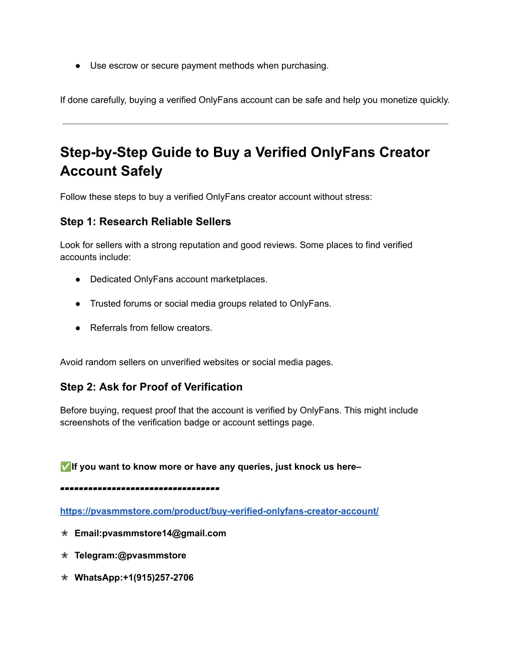 ● Use escrow or secure payment methods when purchasing. If done carefully, buying a verified OnlyFans account can be safe and help you monetize quickly. Step-by-Step Guide to Buy a Verified OnlyFans Creator Account Safely Follow these steps to buy a verified OnlyFans creator account without stress: Step 1: Research Reliable Sellers Look for sellers with a strong reputation and good reviews. Some places to find verified accounts include: ● Dedicated OnlyFans account marketplaces. ● Trusted forums or social media groups related to OnlyFans. ● Referrals from fellow creators. Avoid random sellers on unverified websites or social media pages. Step 2: Ask for Proof of Verification Before buying, request proof that the account is verified by OnlyFans. This might include screenshots of the verification badge or account settings page. ✅If you want to know more or have any queries, just knock us here– ▰▰▰▰▰▰▰▰▰▰▰▰▰▰▰▰▰▰▰▰▰▰▰▰▰▰▰▰▰▰▰▰▰▰ https://pvasmmstore.com/product/buy-verified-onlyfans-creator-account/ ✮ Email:pvasmmstore14@gmail.com ✮ Telegram:@pvasmmstore ✮ WhatsApp:+1(915)257-2706