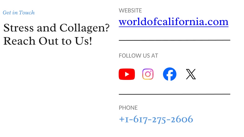 6. WEBSITE • Get in Touch • worldofcalifornia.com • Stress and Collagen? Reach Out to Us! • FOLLOW US AT • PHONE • +1-617-275-2606