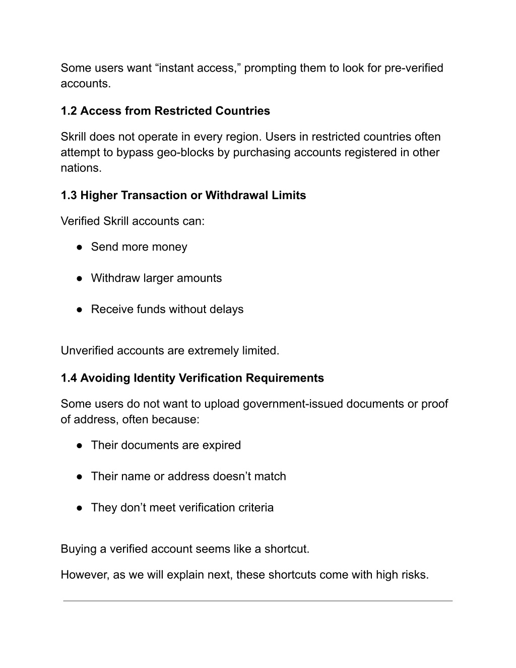 Some users want “instant access,” prompting them to look for pre-verified accounts. 1.2 Access from Restricted Countries Skrill does not operate in every region. Users in restricted countries often attempt to bypass geo-blocks by purchasing accounts registered in other nations. 1.3 Higher Transaction or Withdrawal Limits Verified Skrill accounts can: ● Send more money ● Withdraw larger amounts ● Receive funds without delays Unverified accounts are extremely limited. 1.4 Avoiding Identity Verification Requirements Some users do not want to upload government-issued documents or proof of address, often because: ● Their documents are expired ● Their name or address doesn’t match ● They don’t meet verification criteria Buying a verified account seems like a shortcut. However, as we will explain next, these shortcuts come with high risks.