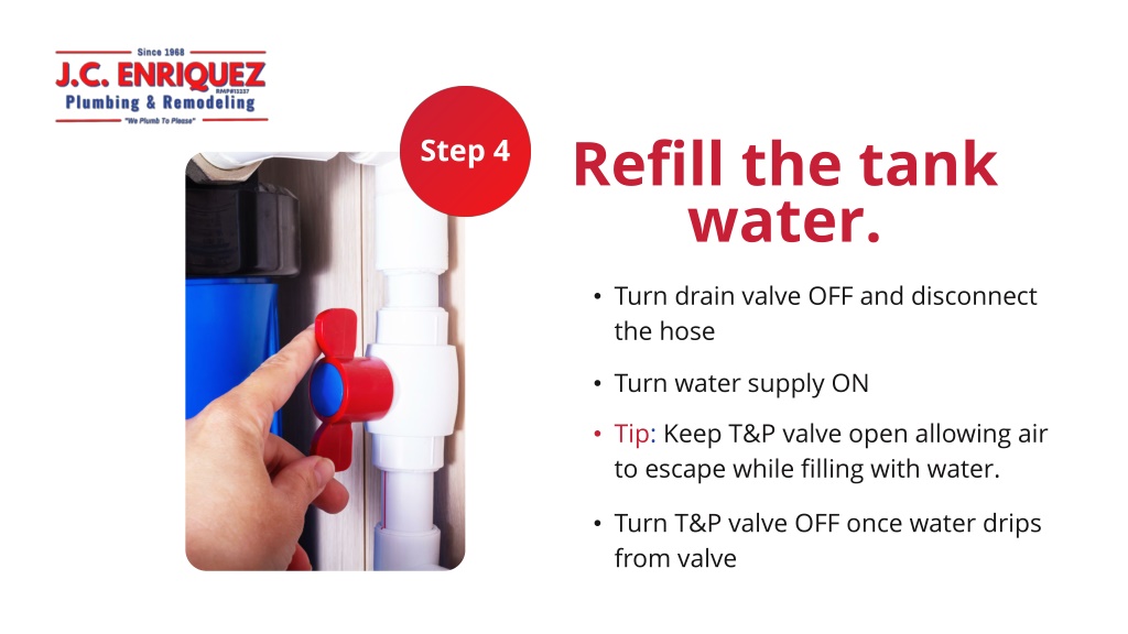 Step 4 Refill the tank water. • Turn drain valve OFF and disconnect the hose • Turn water supply ON • Tip: Keep T&P valve open allowing air to escape while filling with water. • Turn T&P valve OFF once water drips from valve