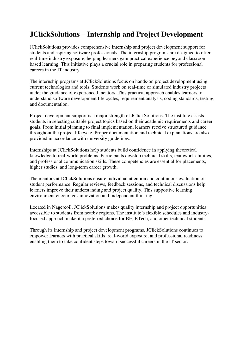 JClickSolutions – Internship and Project Development JClickSolutions provides comprehensive internship and project development support for students and aspiring software professionals. The internship programs are designed to offer real-time industry exposure, helping learners gain practical experience beyond classroom- based learning. This initiative plays a crucial role in preparing students for professional careers in the IT industry. The internship programs at JClickSolutions focus on hands-on project development using current technologies and tools. Students work on real-time or simulated industry projects under the guidance of experienced mentors. This practical approach enables learners to understand software development life cycles, requirement analysis, coding standards, testing, and documentation. Project development support is a major strength of JClickSolutions. The institute assists students in selecting suitable project topics based on their academic requirements and career goals. From initial planning to final implementation, learners receive structured guidance throughout the project lifecycle. Proper documentation and technical explanations are also provided in accordance with university guidelines. Internships at JClickSolutions help students build confidence in applying theoretical knowledge to real-world problems. Participants develop technical skills, teamwork abilities, and professional communication skills. These competencies are essential for placements, higher studies, and long-term career growth. The mentors at JClickSolutions ensure individual attention and continuous evaluation of student performance. Regular reviews, feedback sessions, and technical discussions help learners improve their understanding and project quality. This supportive learning environment encourages innovation and independent thinking. Located in Nagercoil, JClickSolutions makes quality internship and project opportunities accessible to students from nearby regions. The institute’s flexible schedules and industry- focused approach make it a preferred choice for BE, BTech, and other technical students. Through its internship and project development programs, JClickSolutions continues to empower learners with practical skills, real-world exposure, and professional readiness, enabling them to take confident steps toward successful careers in the IT sector.