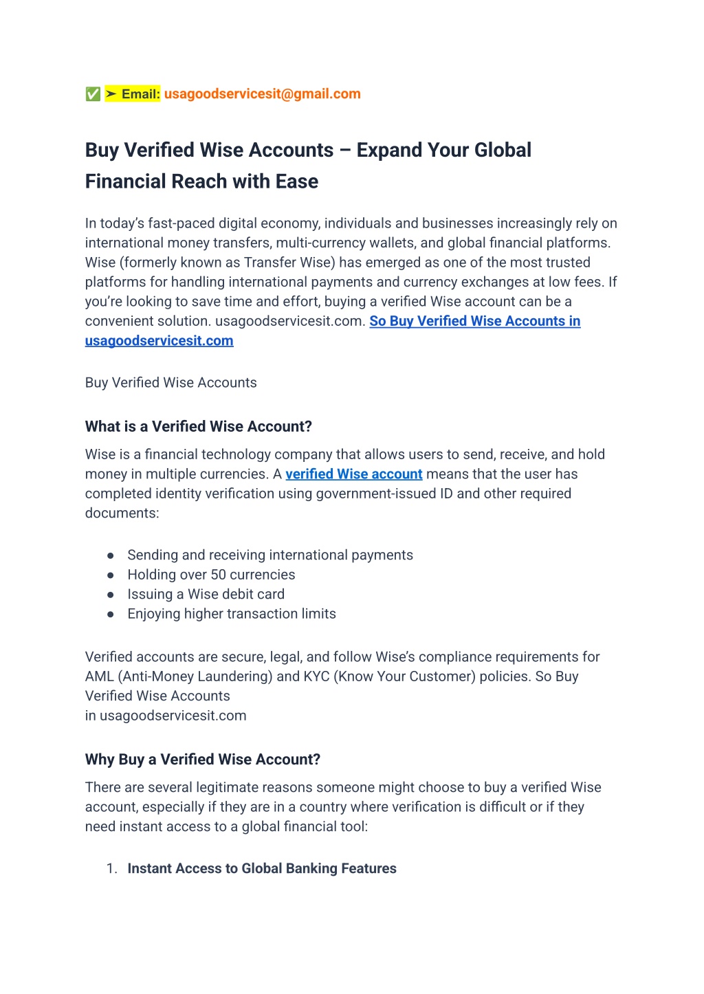 ✅➤ Email: usagoodservicesit@gmail.com Buy Verified Wise Accounts – Expand Your Global Financial Reach with Ease In today’s fast-paced digital economy, individuals and businesses increasingly rely on international money transfers, multi-currency wallets, and global financial platforms. Wise (formerly known as Transfer Wise) has emerged as one of the most trusted platforms for handling international payments and currency exchanges at low fees. If you’re looking to save time and effort, buying a verified Wise account can be a convenient solution. usagoodservicesit.com. So Buy Verified Wise Accounts in usagoodservicesit.com Buy Verified Wise Accounts What is a Verified Wise Account? Wise is a financial technology company that allows users to send, receive, and hold money in multiple currencies. Averified Wise accountmeans that the user has completed identity verification using government-issued ID and other required documents: ● Sending and receiving international payments ● Holding over 50 currencies ● Issuing a Wise debit card ● Enjoying higher transaction limits Verified accounts are secure, legal, and follow Wise’s compliance requirements for AML (Anti-Money Laundering) and KYC (Know Your Customer) policies. So Buy Verified Wise Accounts in usagoodservicesit.com Why Buy a Verified Wise Account? There are several legitimate reasons someone might choose to buy a verified Wise account, especially if they are in a country where verification is difficult or if they need instant access to a global financial tool: 1. Instant Access to Global Banking Features
