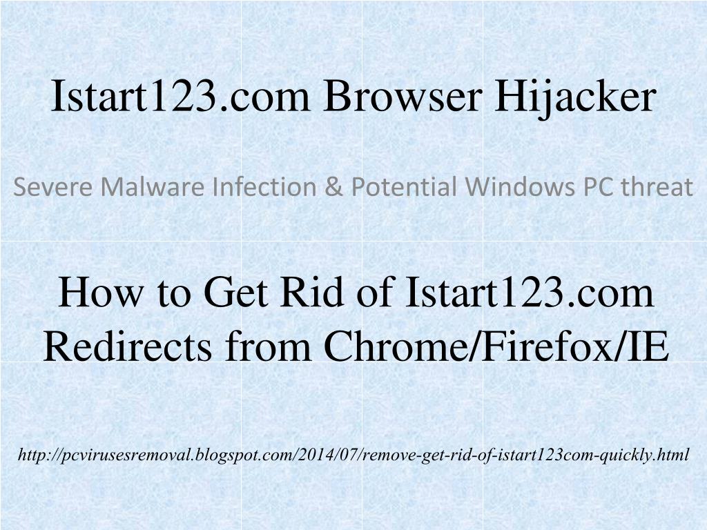 Istart123.com Browser Hijacker How to Get Rid of Istart123.com Redirects from Chrome/Firefox/IE Severe Malware Infection & Potential Windows PC threat http://pcvirusesremoval.blogspot.com/2014/07/remove-get-rid-of-istart123com-quickly.html