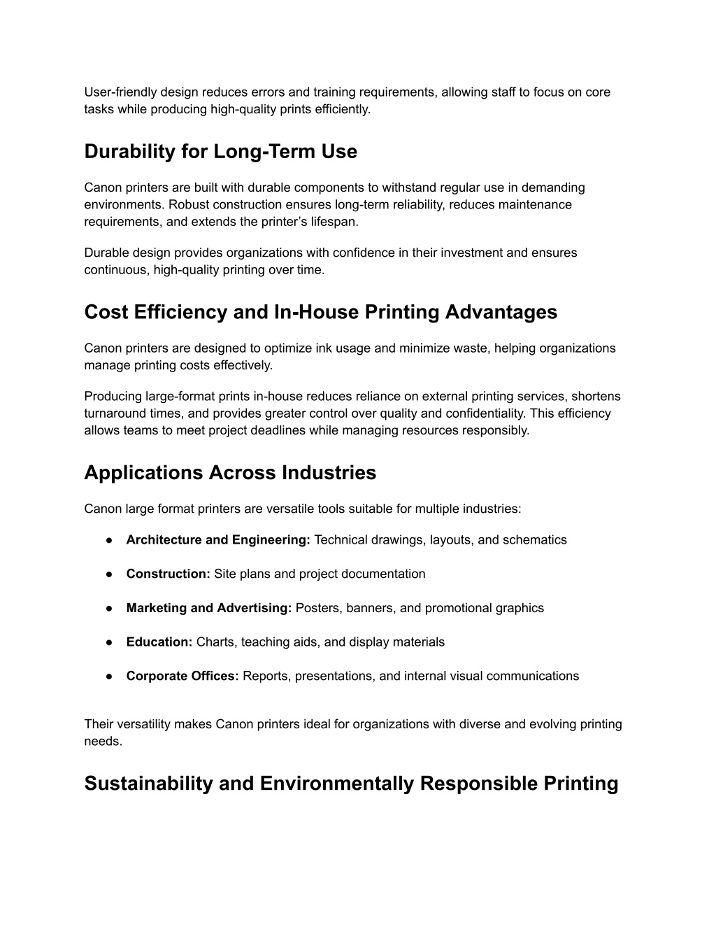 User-friendly design reduces errors and training requirements, allowing staff to focus on core tasks while producing high-quality prints efficiently. Durability for Long-Term Use Canon printers are built with durable components to withstand regular use in demanding environments. Robust construction ensures long-term reliability, reduces maintenance requirements, and extends the printer’s lifespan. Durable design provides organizations with confidence in their investment and ensures continuous, high-quality printing over time. Cost Efficiency and In-House Printing Advantages Canon printers are designed to optimize ink usage and minimize waste, helping organizations manage printing costs effectively. Producing large-format prints in-house reduces reliance on external printing services, shortens turnaround times, and provides greater control over quality and confidentiality. This efficiency allows teams to meet project deadlines while managing resources responsibly. Applications Across Industries Canon large format printers are versatile tools suitable for multiple industries: ● Architecture and Engineering: Technical drawings, layouts, and schematics ● Construction: Site plans and project documentation ● Marketing and Advertising: Posters, banners, and promotional graphics ● Education: Charts, teaching aids, and display materials ● Corporate Offices: Reports, presentations, and internal visual communications Their versatility makes Canon printers ideal for organizations with diverse and evolving printing needs. Sustainability and Environmentally Responsible Printing