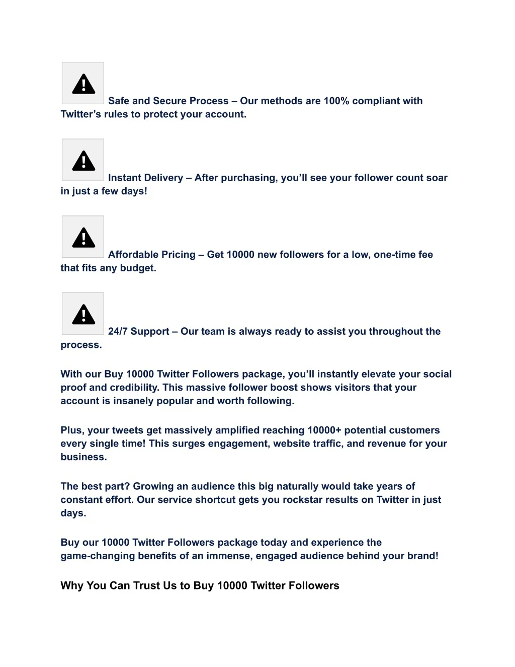 streamlined process, you’ll see your audience explode by 10000 genuine new followers in just a couple of days after purchasing! Unbeatable Low Prices We believe effective Twitter growth shouldn’t break the bank. That’s why our Buy 10000 Twitter Followers package is extremely affordable compared to overpriced competitors. More followers for less money! White Glove Customer Support Our awesome support team is available 24/7 to answer any questions and ensure you have a smooth experience from start to finish when buying 10000 Twitter followers from us. Don’t settle for less than the best when it comes to buying Twitter followers. Our service safely delivers fast results from real users at a great value. With 10000 new followers, you’ll instantly boost your social proof and credibility. Your tweets gain way more visibility to potential customers. And you can better engage your enormous new audience. Awesome Benefits of Buy 10000 Twitter Followers for Your Business Having a strong social media game is crucial for any online business’s success. And when it comes to platforms, Twitter stands tall with its massive user base and viral potential. However, organically growing a huge following can take forever. That’s why the smart move is to buy 10000 Twitter followers! With 10000 followers, your business instantly gains insane credibility and social proof. A colossal audience makes your brand look wildly popular, trustworthy, and worth following. New visitors see those big numbers and are way more likely to check you out. But the benefits don’t stop there. Each time you tweet, your content gets exposed to all 10000 of those followers! That’s 10,000 potential customers seeing your updates, promotions, and offerings. The visibility alone drives a ton of interested traffic to your website. Having 10000 Twitter followers also allows you to better understand and engage your audience. You can gather feedback, learn exactly what people want, and