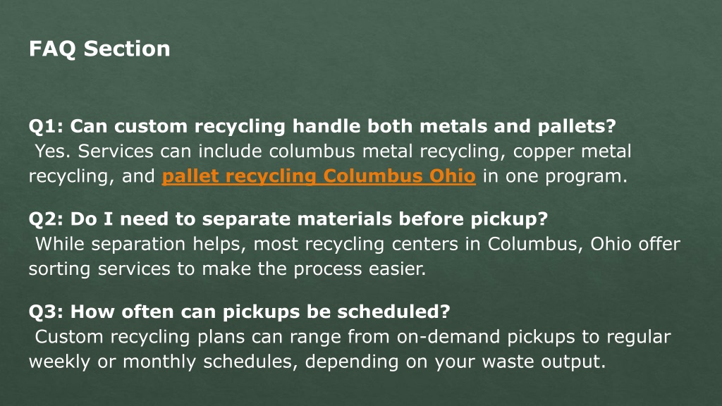 FAQ Section Q1: Can custom recycling handle both metals and pallets? Yes. Services can include columbus metal recycling, copper metal recycling, and pallet recycling Columbus Ohio in one program. Q2: Do I need to separate materials before pickup? While separation helps, most recycling centers in Columbus, Ohio offer sorting services to make the process easier. Q3: How often can pickups be scheduled? Custom recycling plans can range from on-demand pickups to regular weekly or monthly schedules, depending on your waste output.